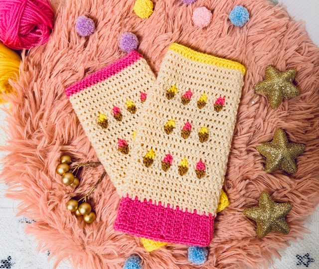 Handmade Crochet arm warmers with ice cream pattern in pink and yellow for winter or autumn for adults