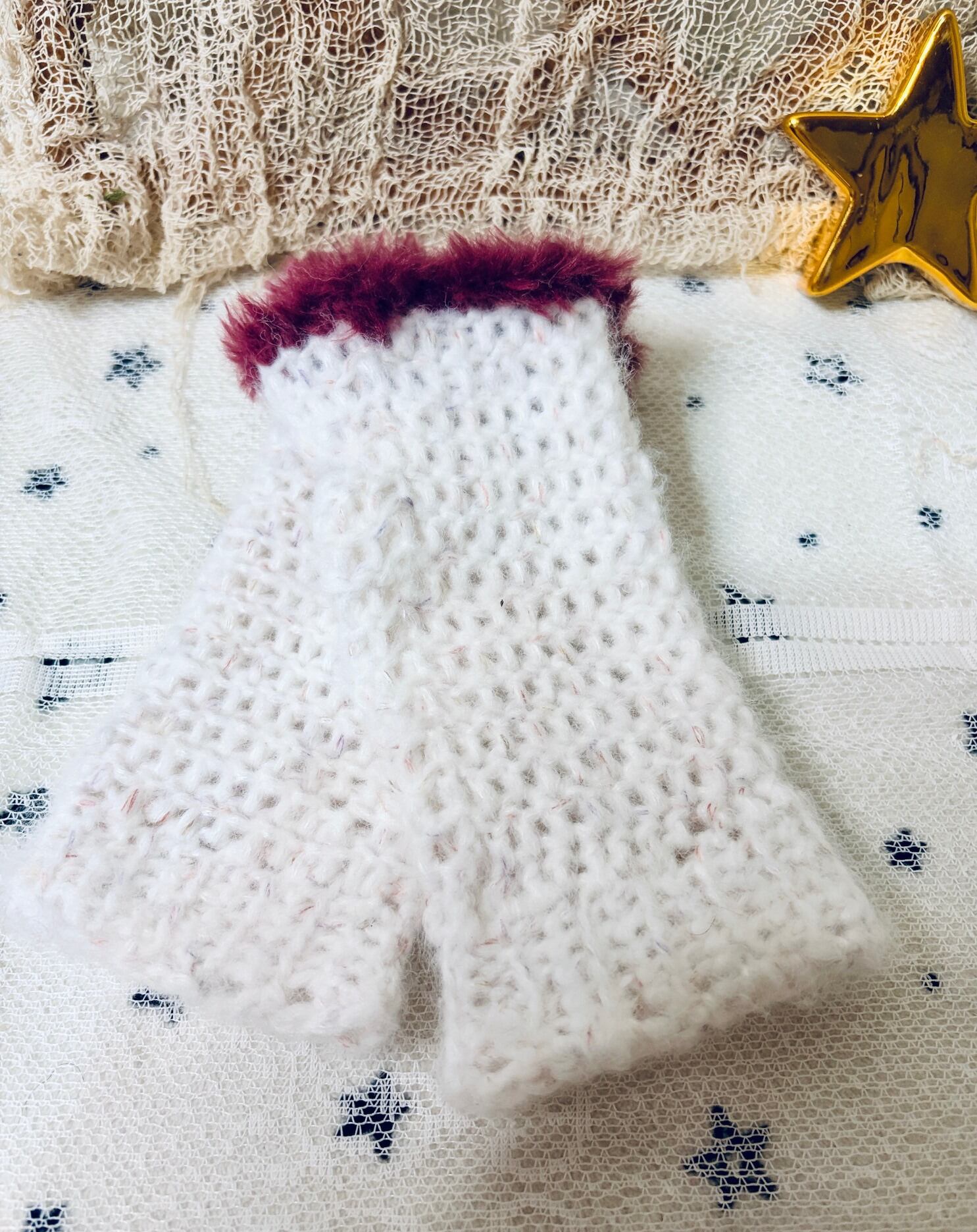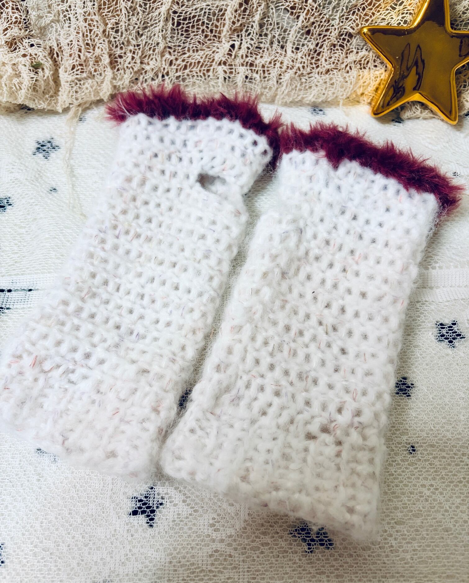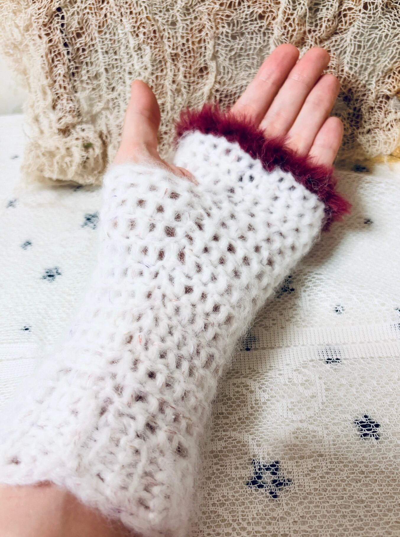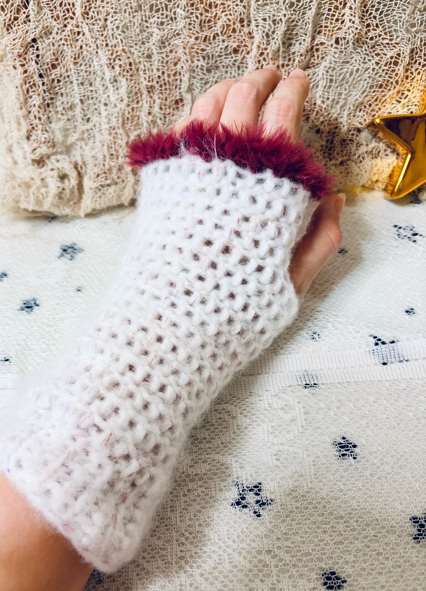 Fluffy handmade crochet arm warmers in white with red fur for winter or autum
