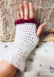 Hand-crocheted arm warmers. They're fluffy and feel very soft.