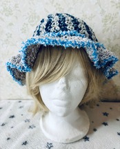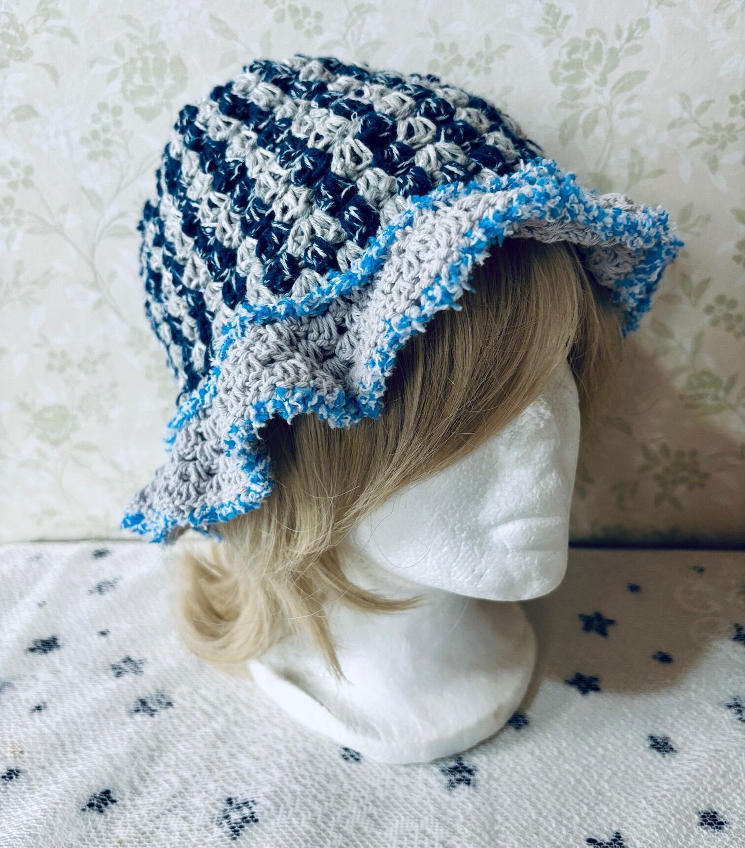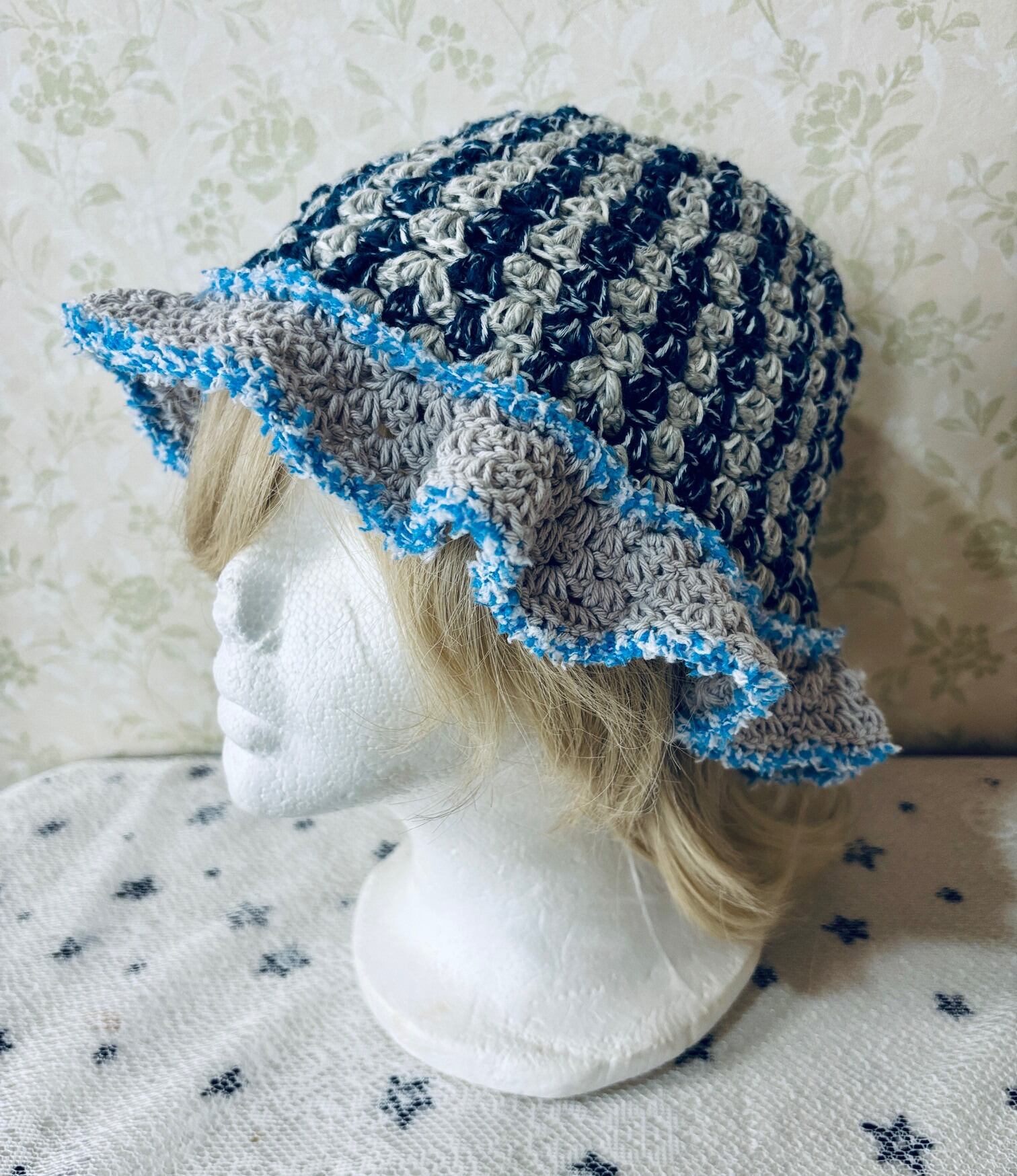 Handmade crochet blue and grey bucket hat with blue frill for spring or summer