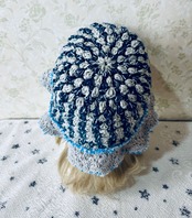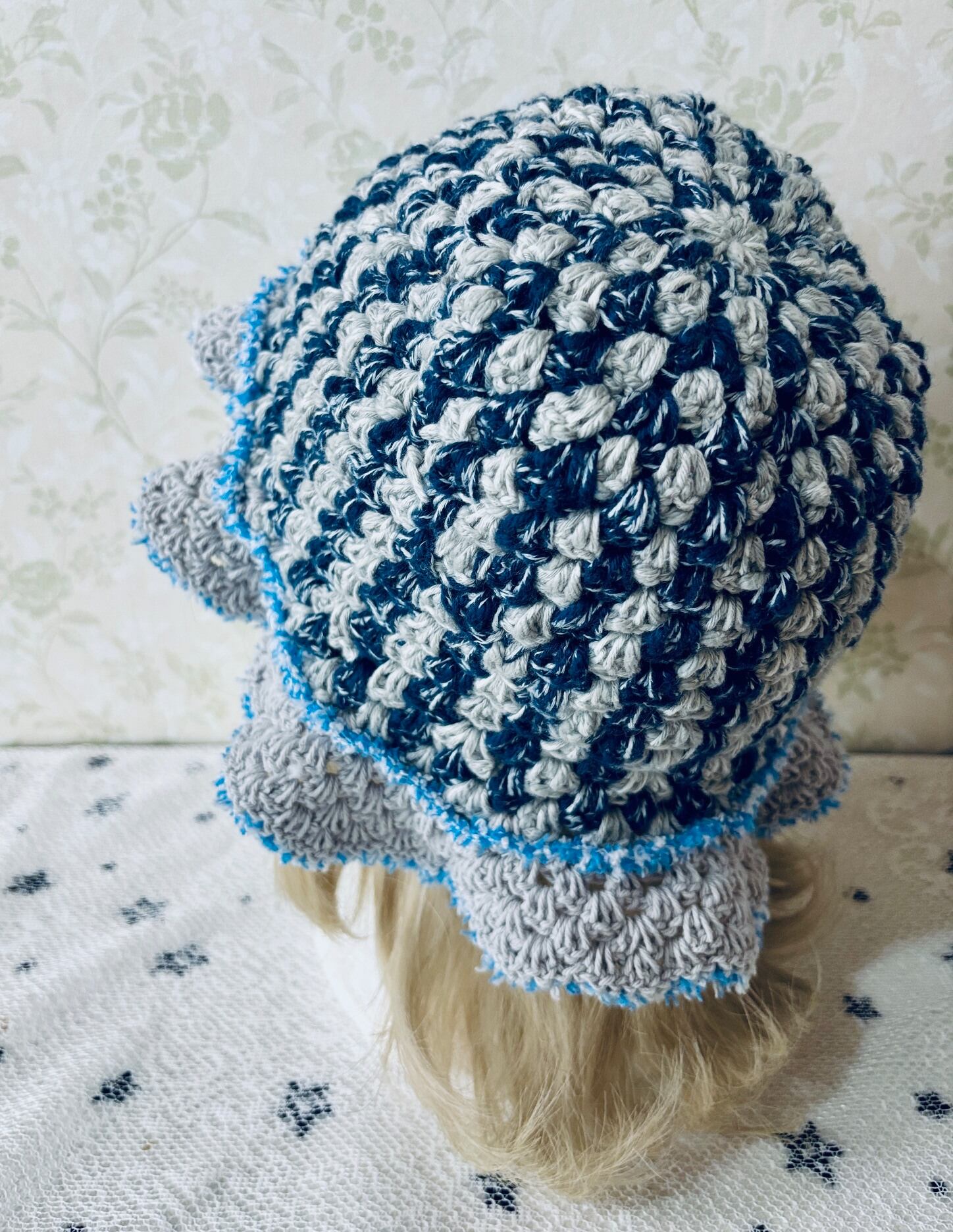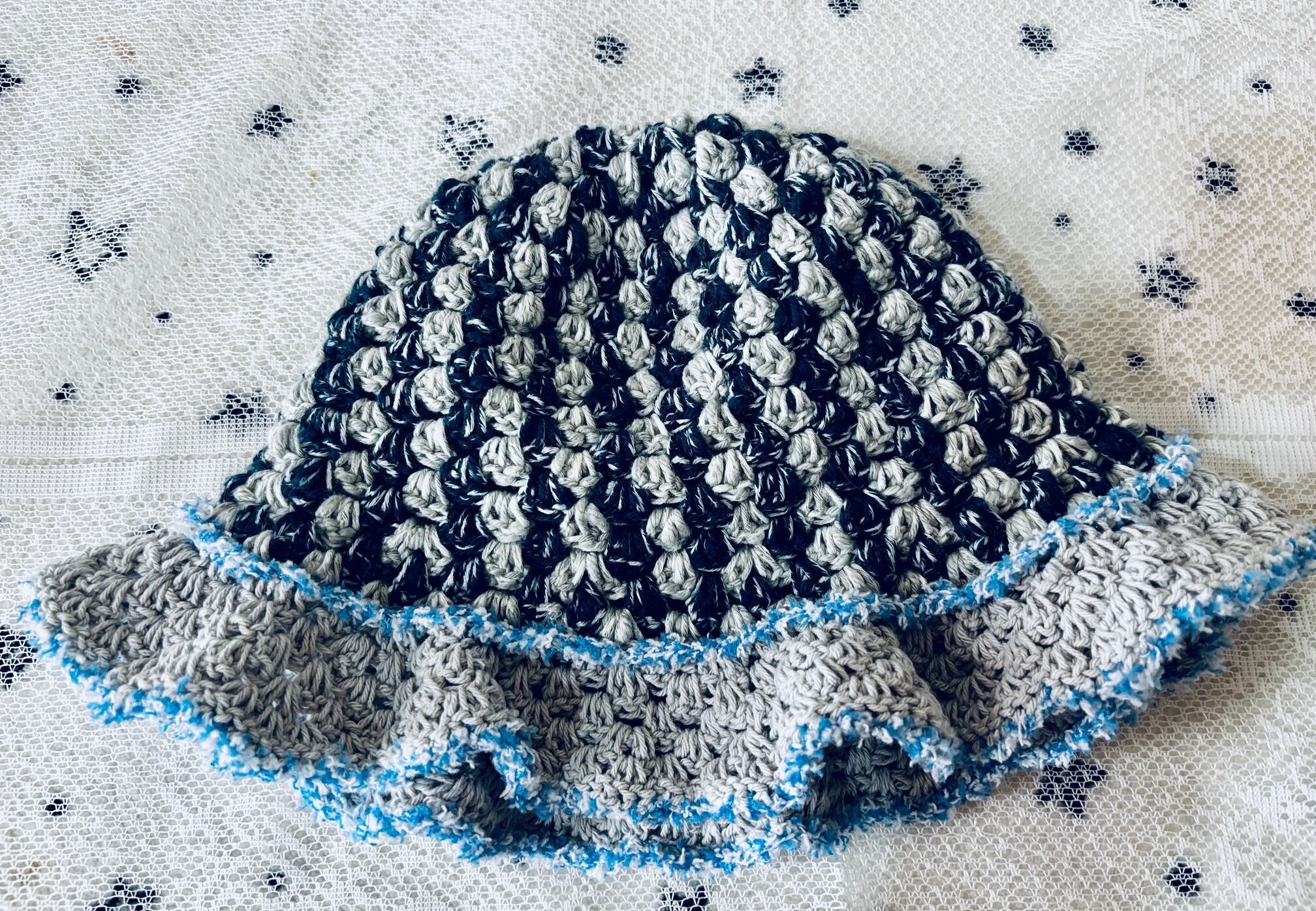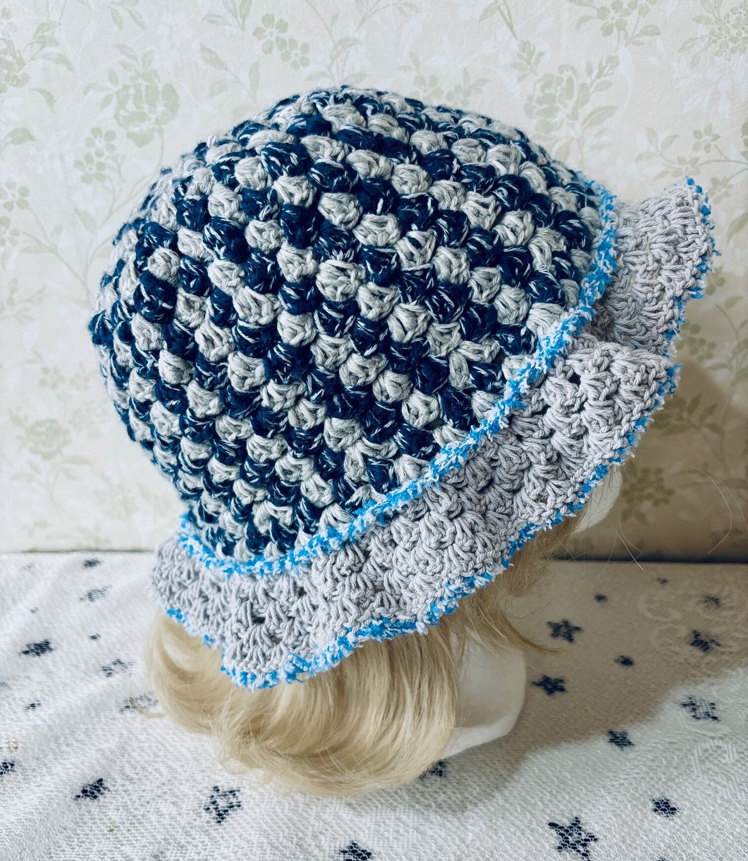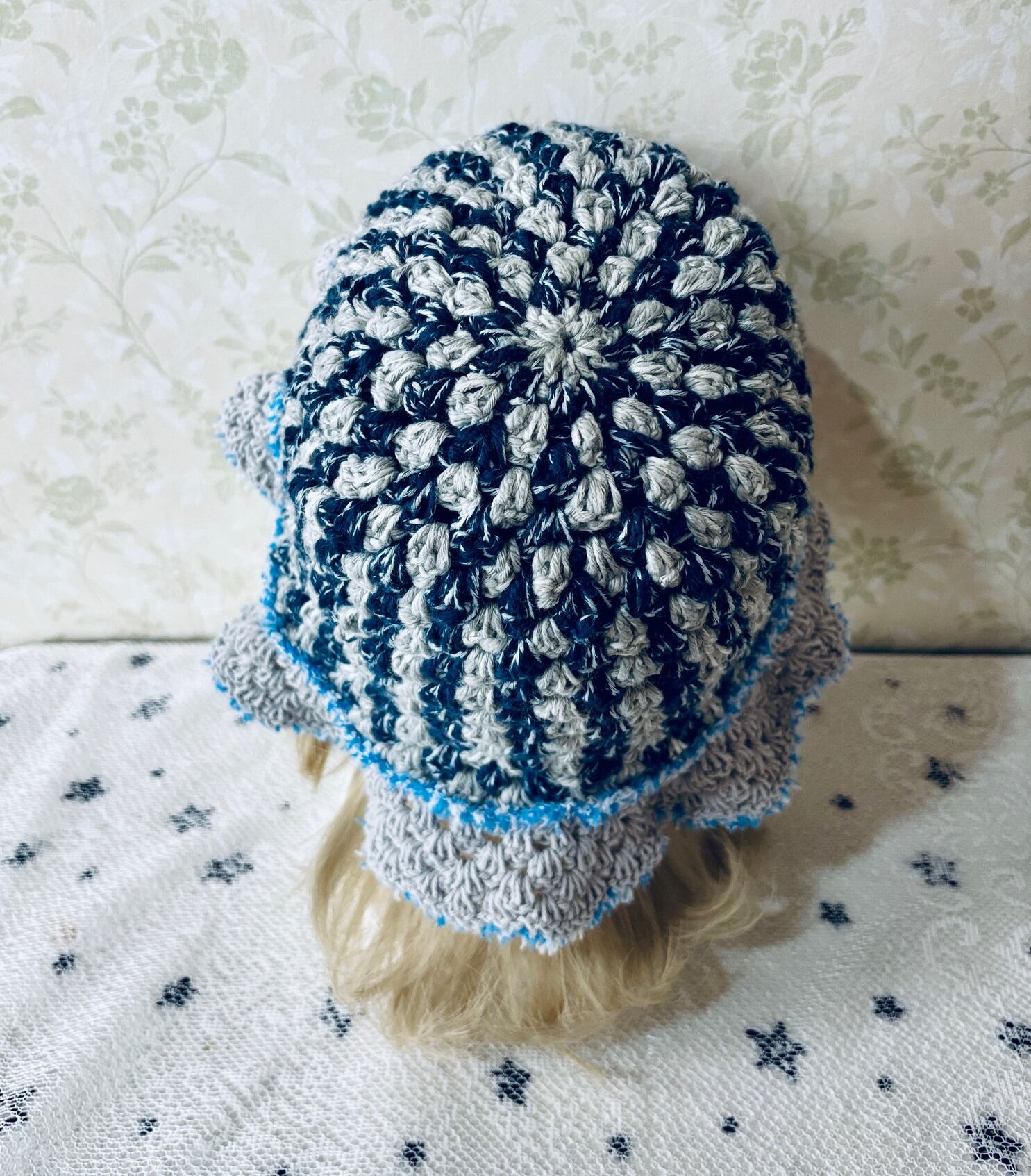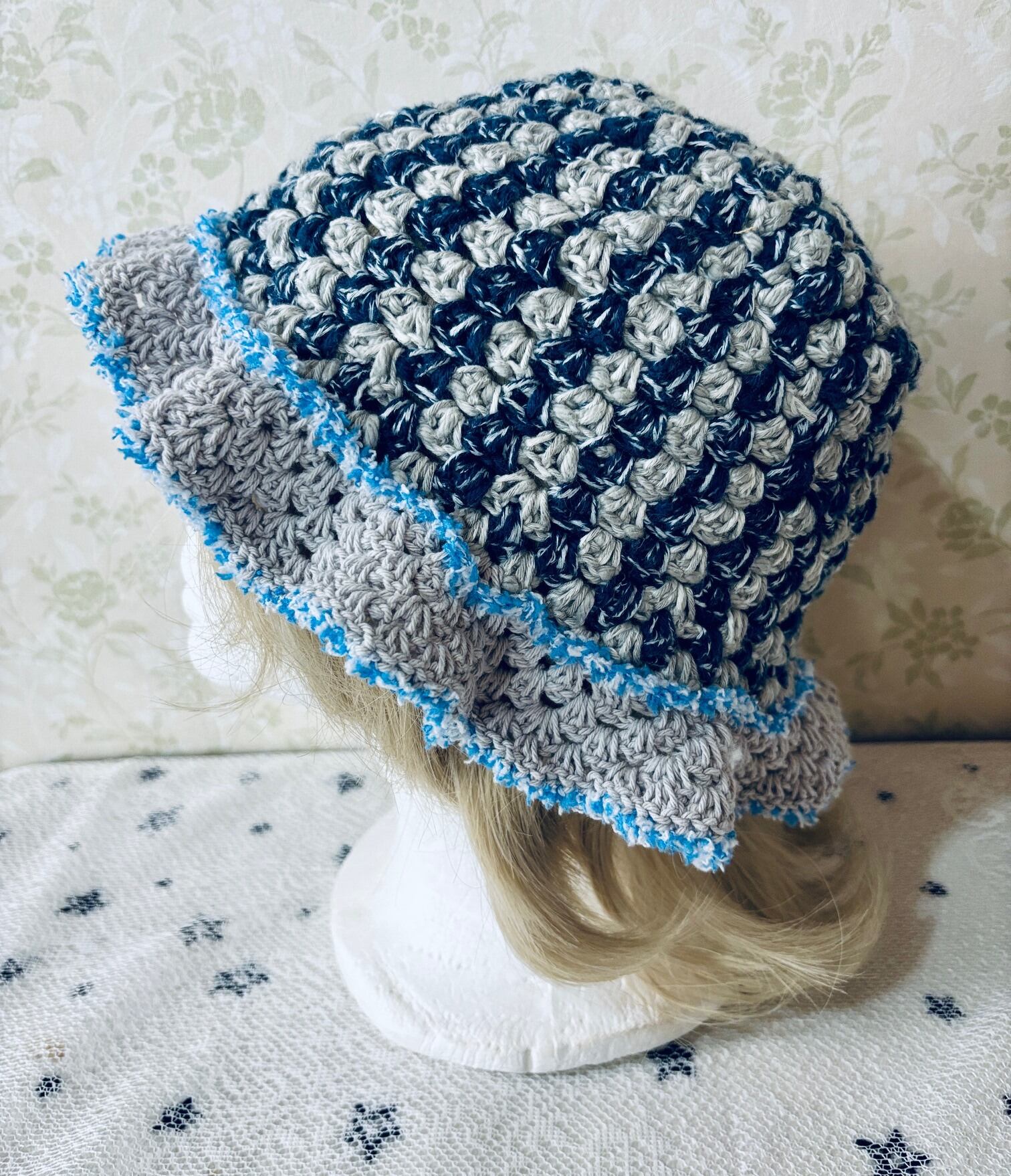 Hand-crocheted bucket hat for spring and summer. It comes in blue and grey colors and has a cute blue frill.