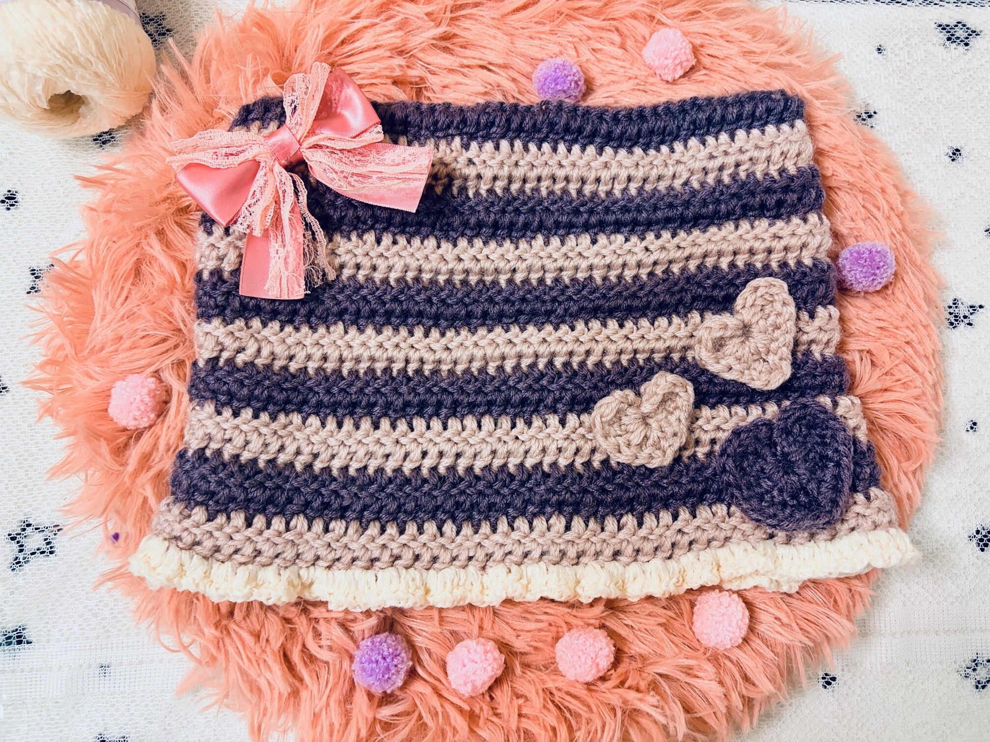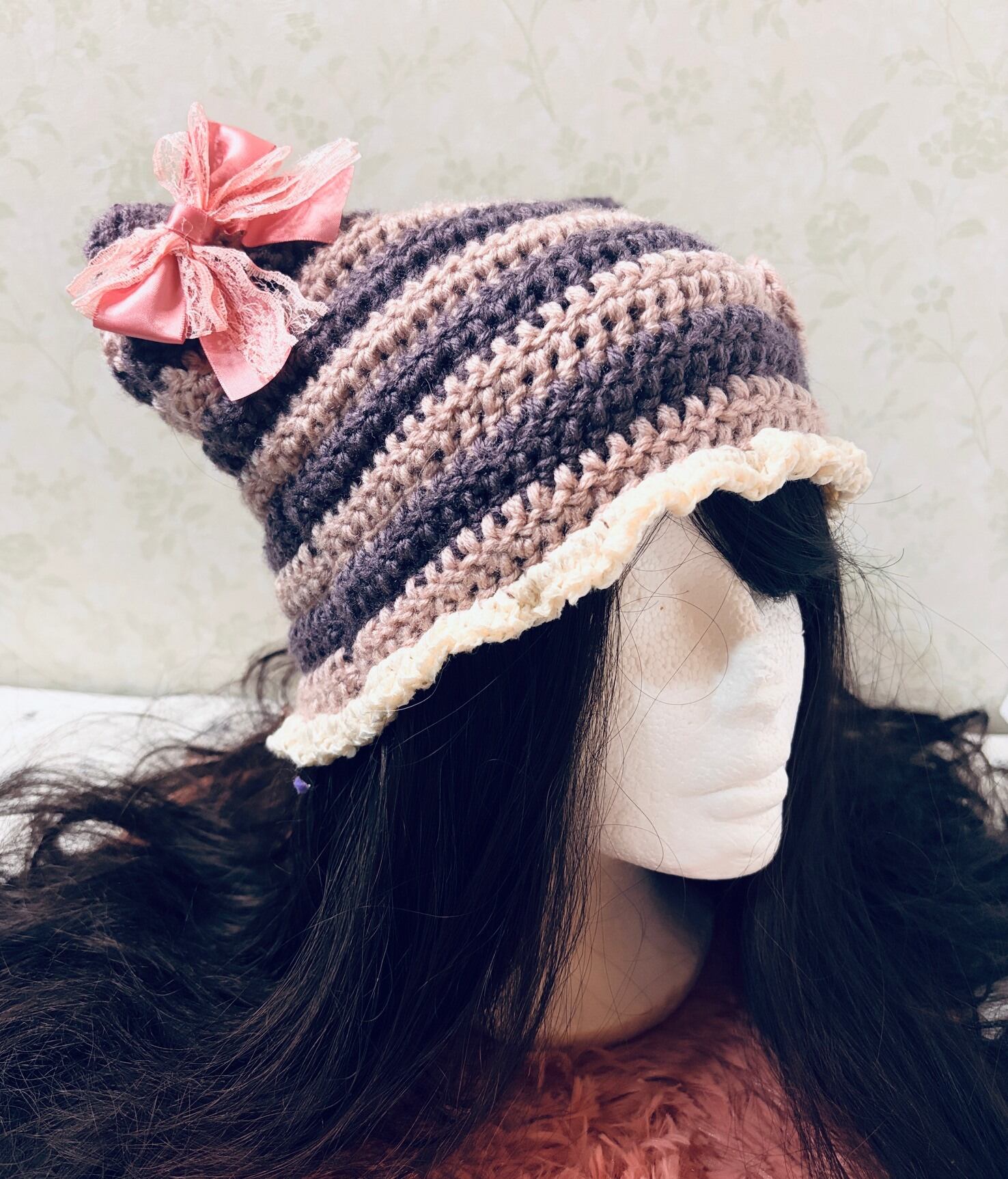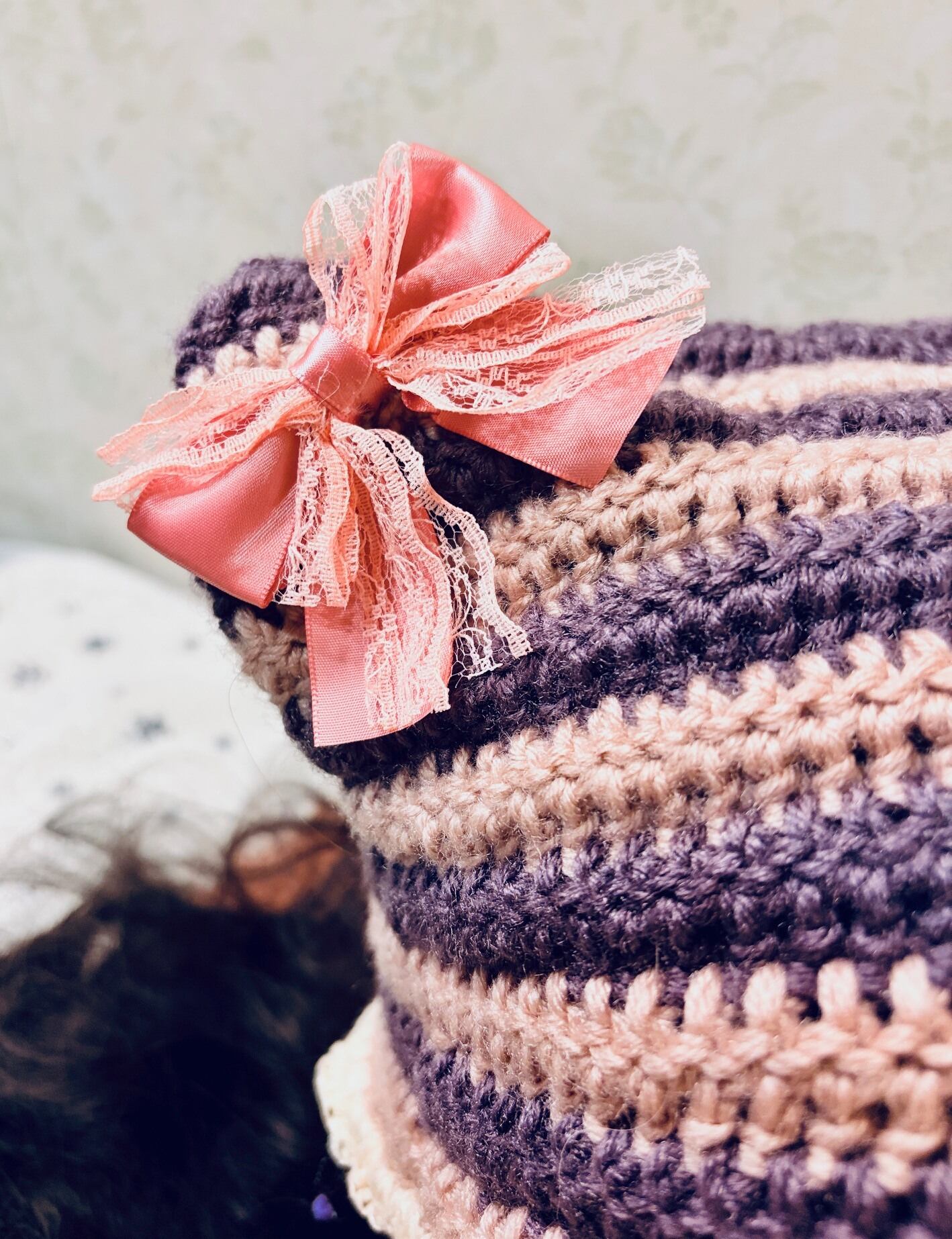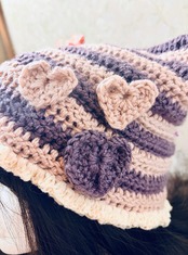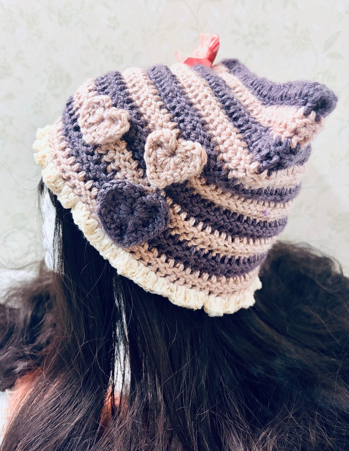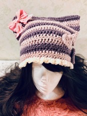 Handmade crochet Cat-ear Beanie in pink and purple with ribbon and heart embroidery for winter or autumn