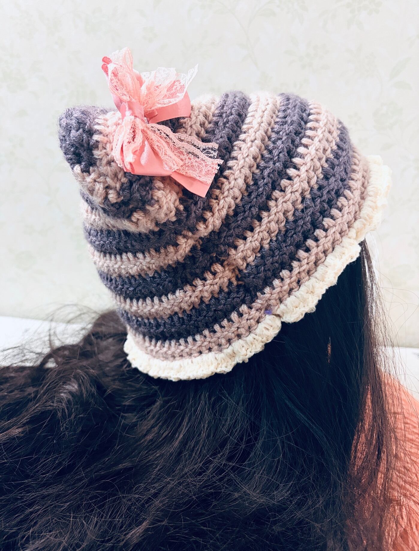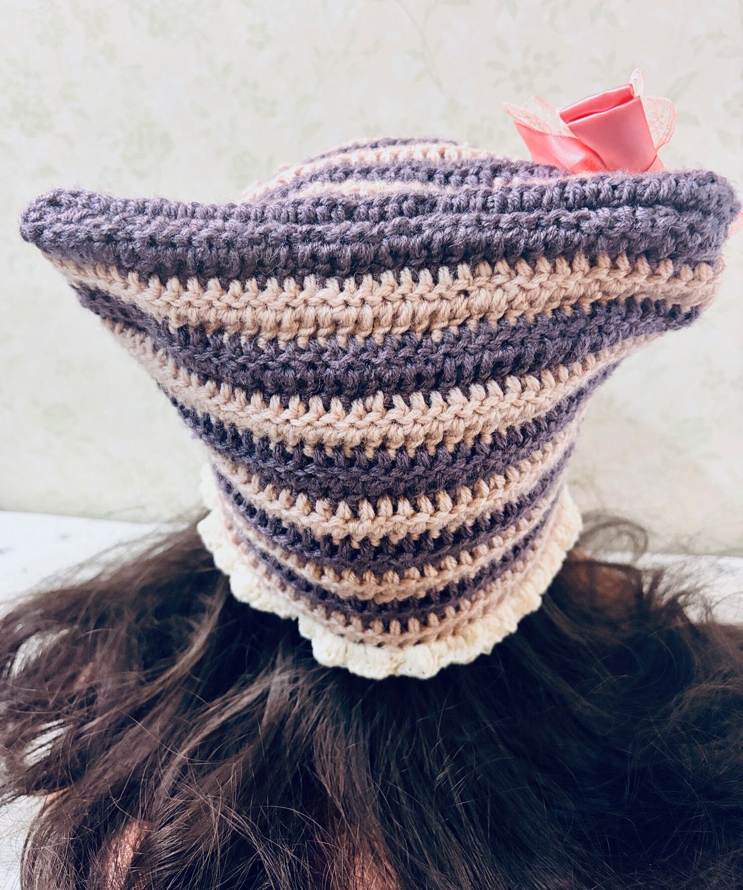 This is a hand-crocheted beanie. When worn, it looks like cat ears and is adorable.