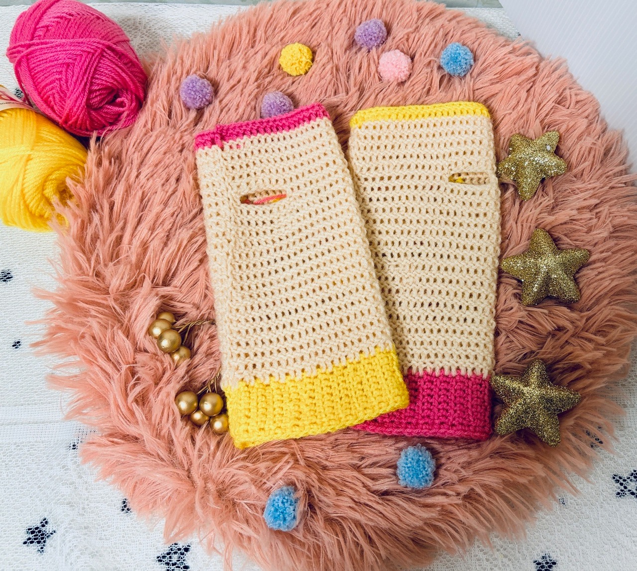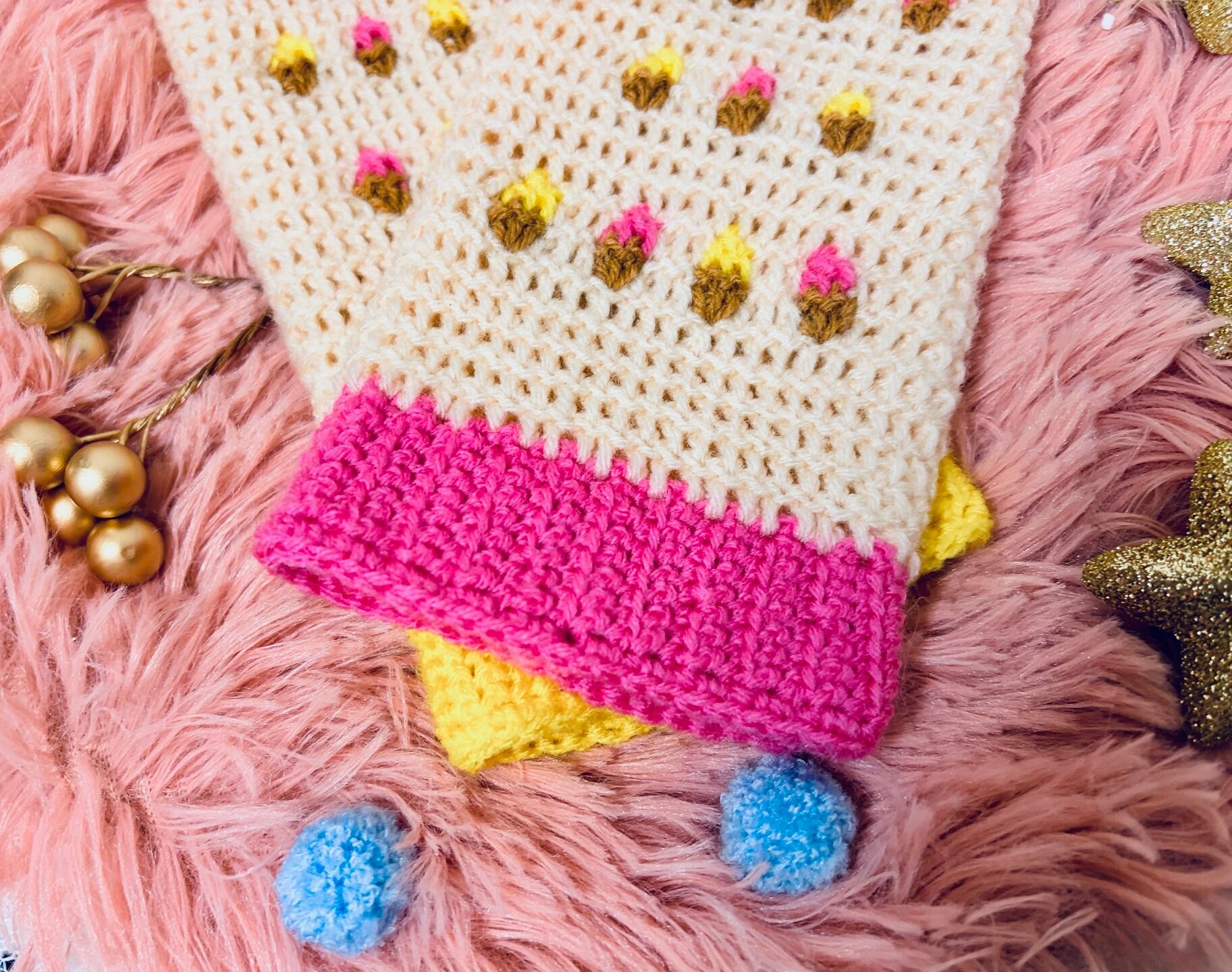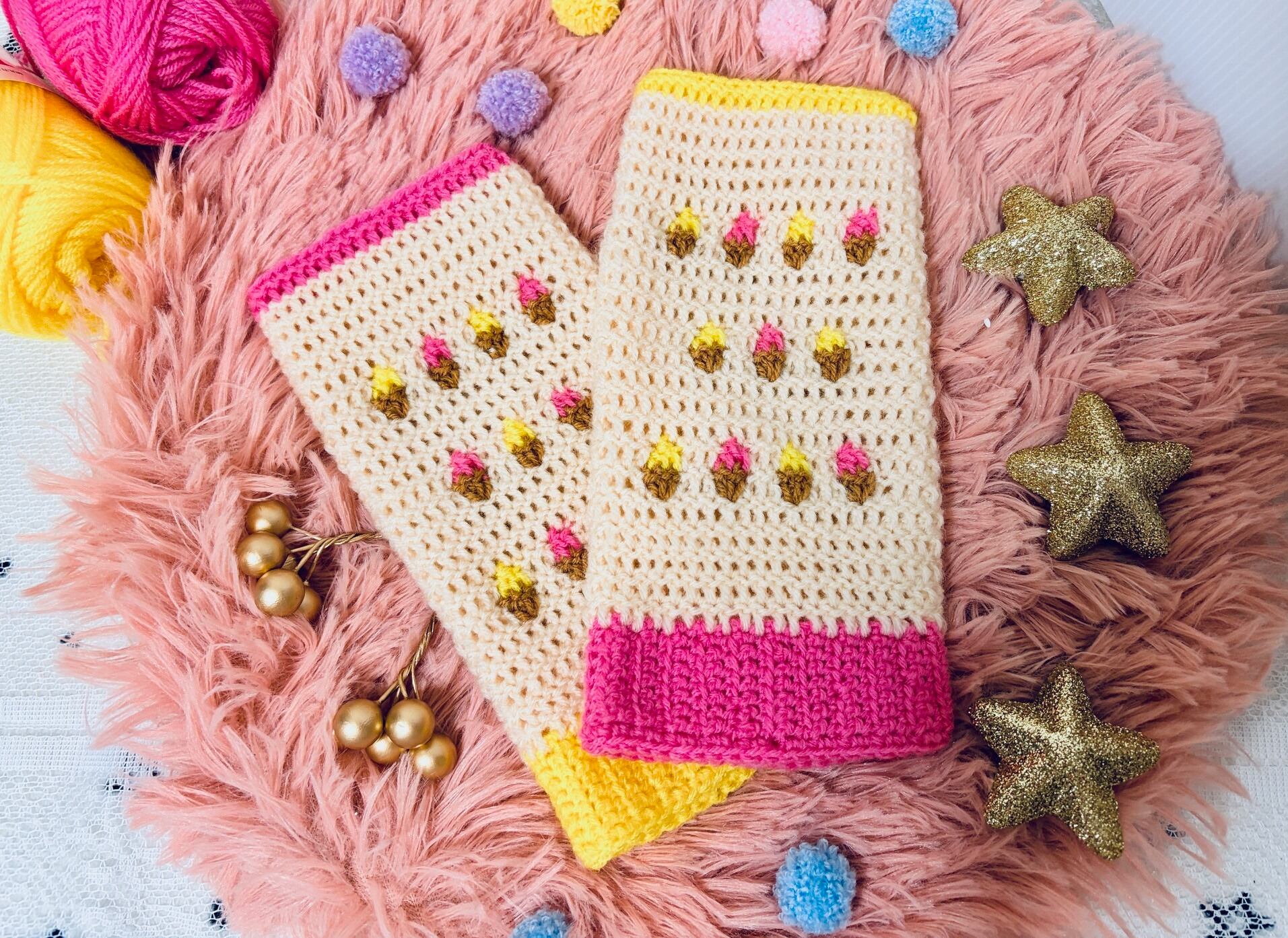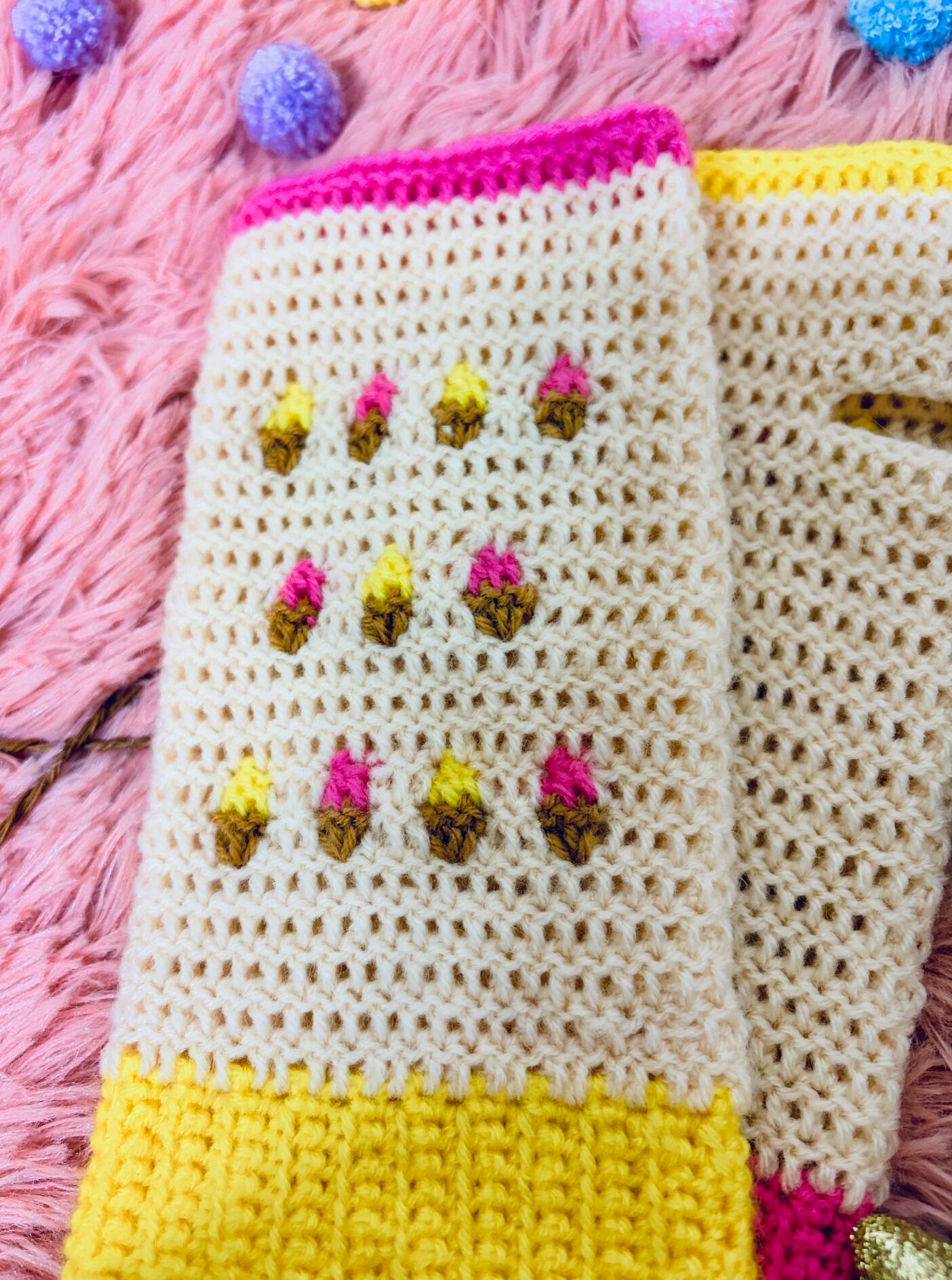 Hand-crocheted arm warmers with a cute ice cream cone pattern in pink and yellow.