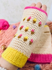 Handmade Crochet arm warmers with ice cream pattern in pink and yellow for winter or autumn for adults