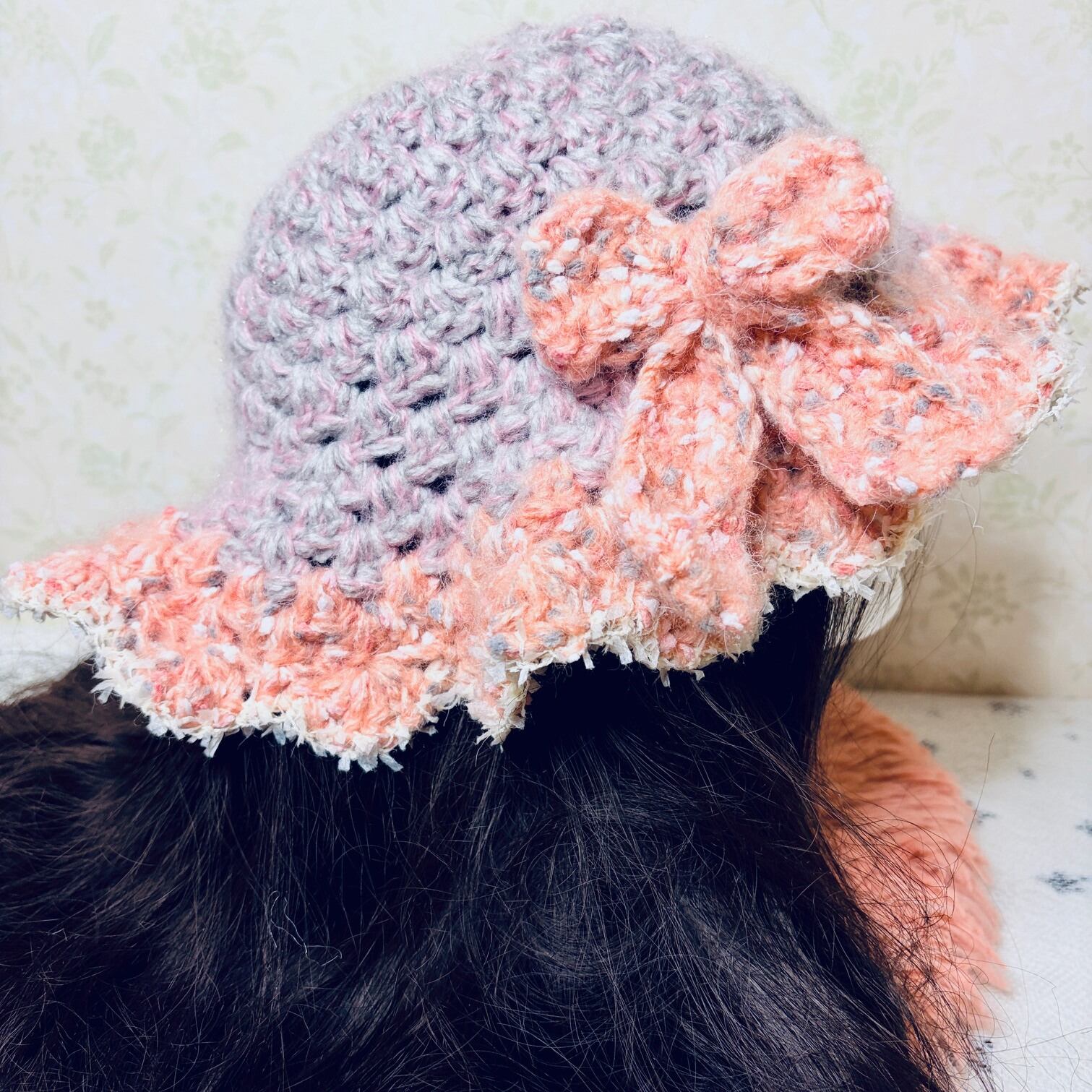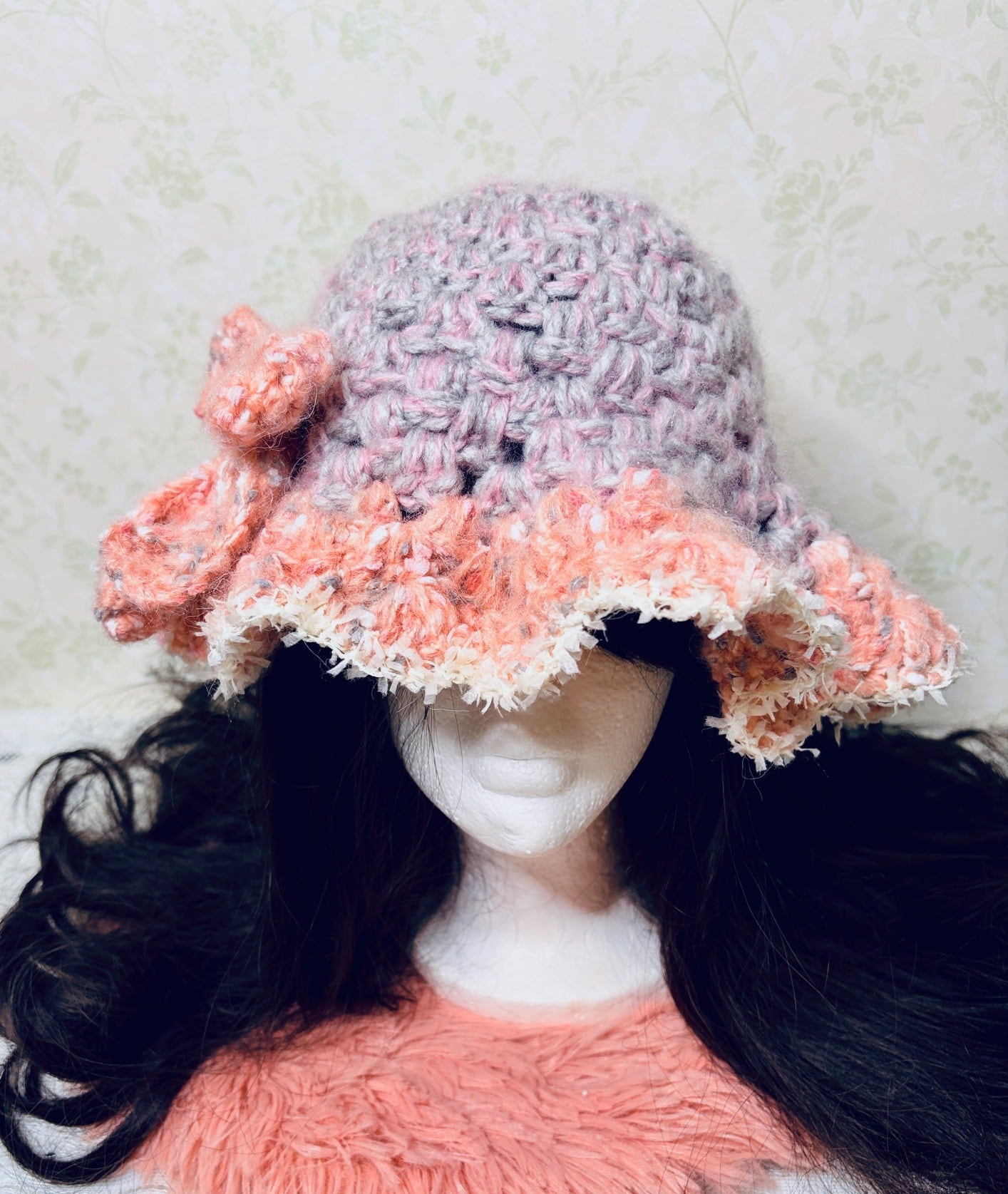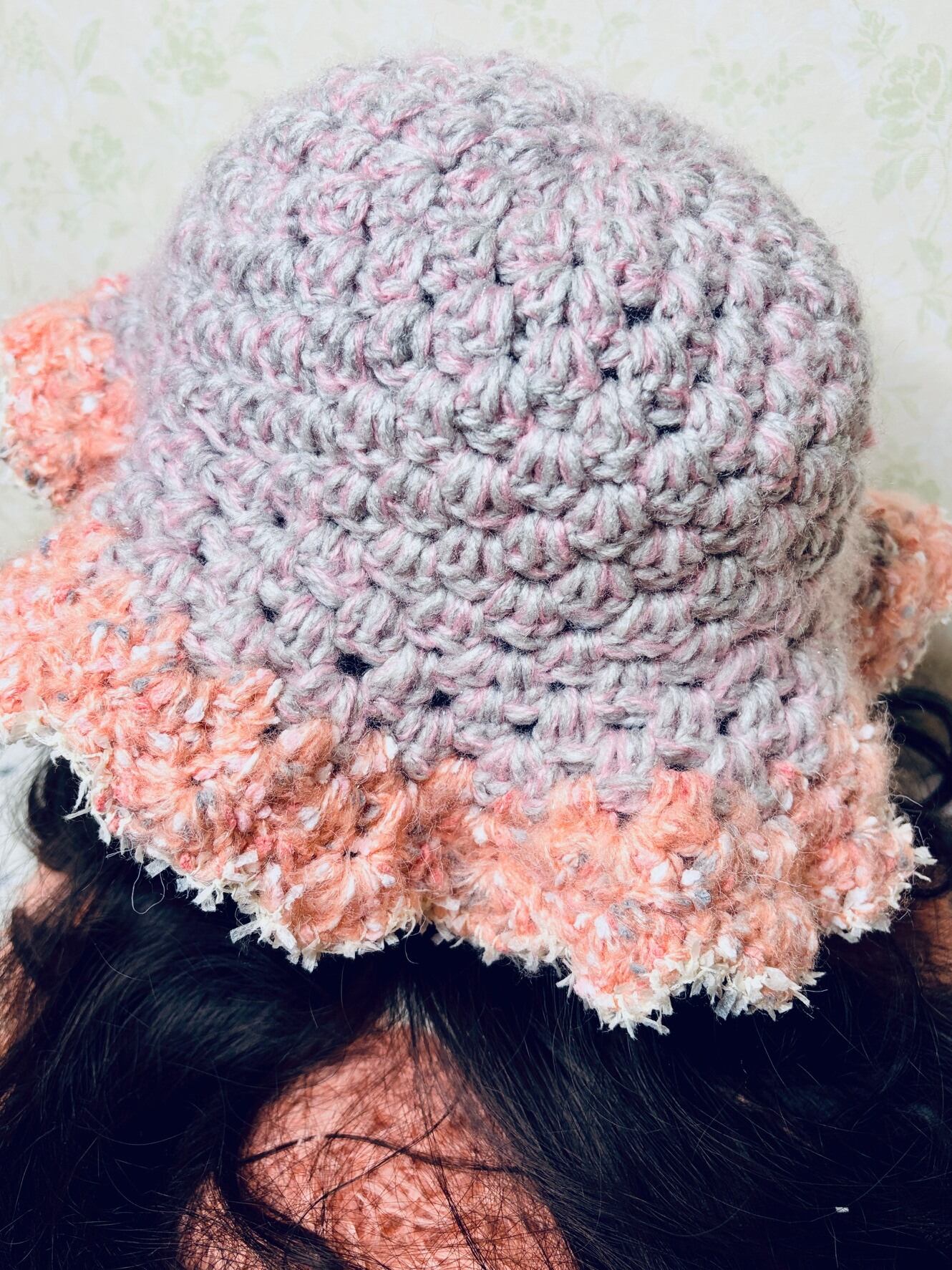 Handmade crochet pink-grey bucket hat with pink frill and ribbon for winter or autumn for adults