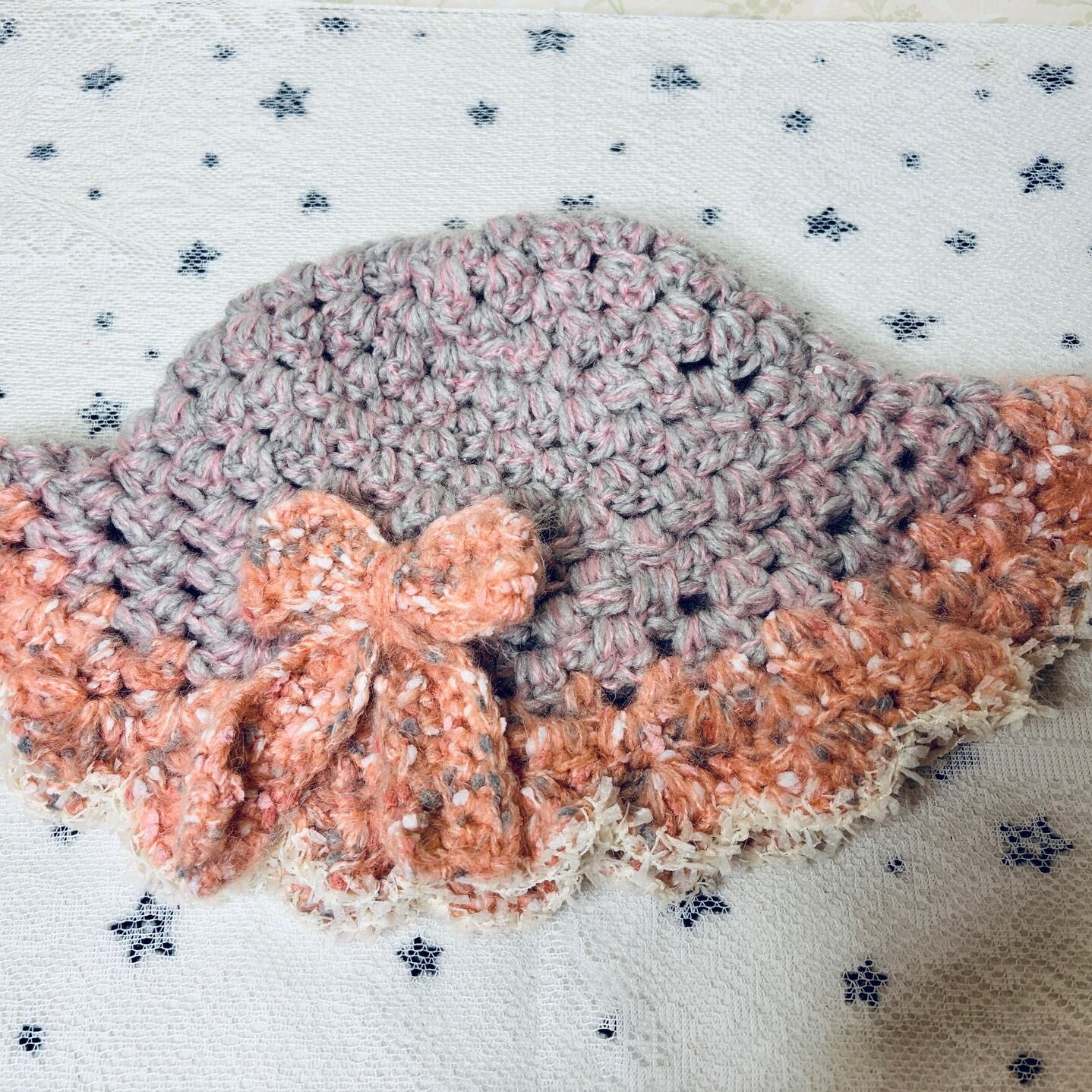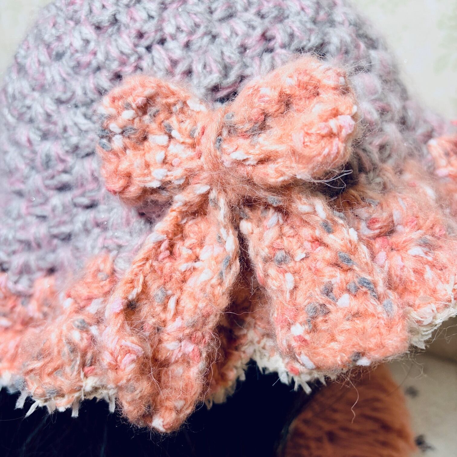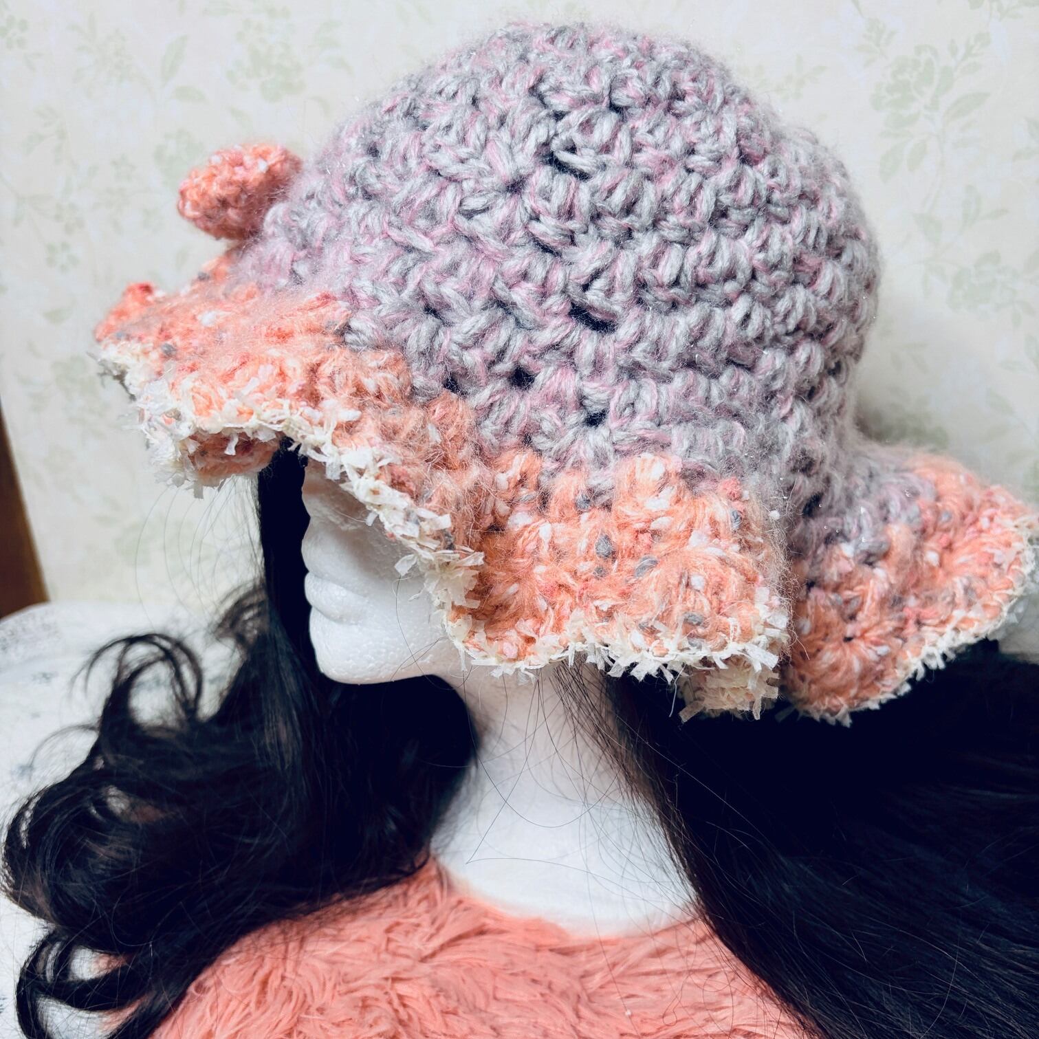 Handmade crochet pink-grey bucket hat with pink frill and ribbon for winter or autumn for adults