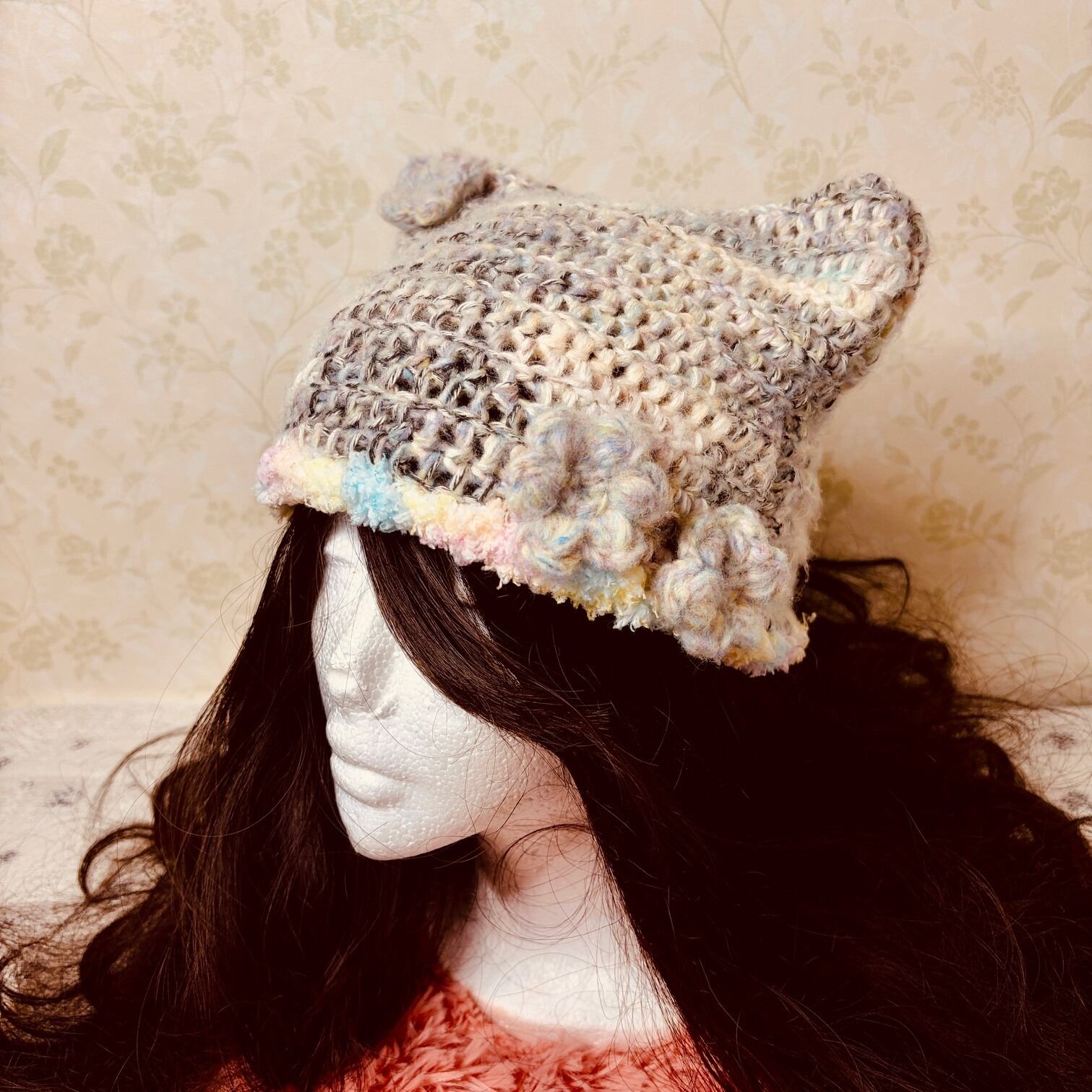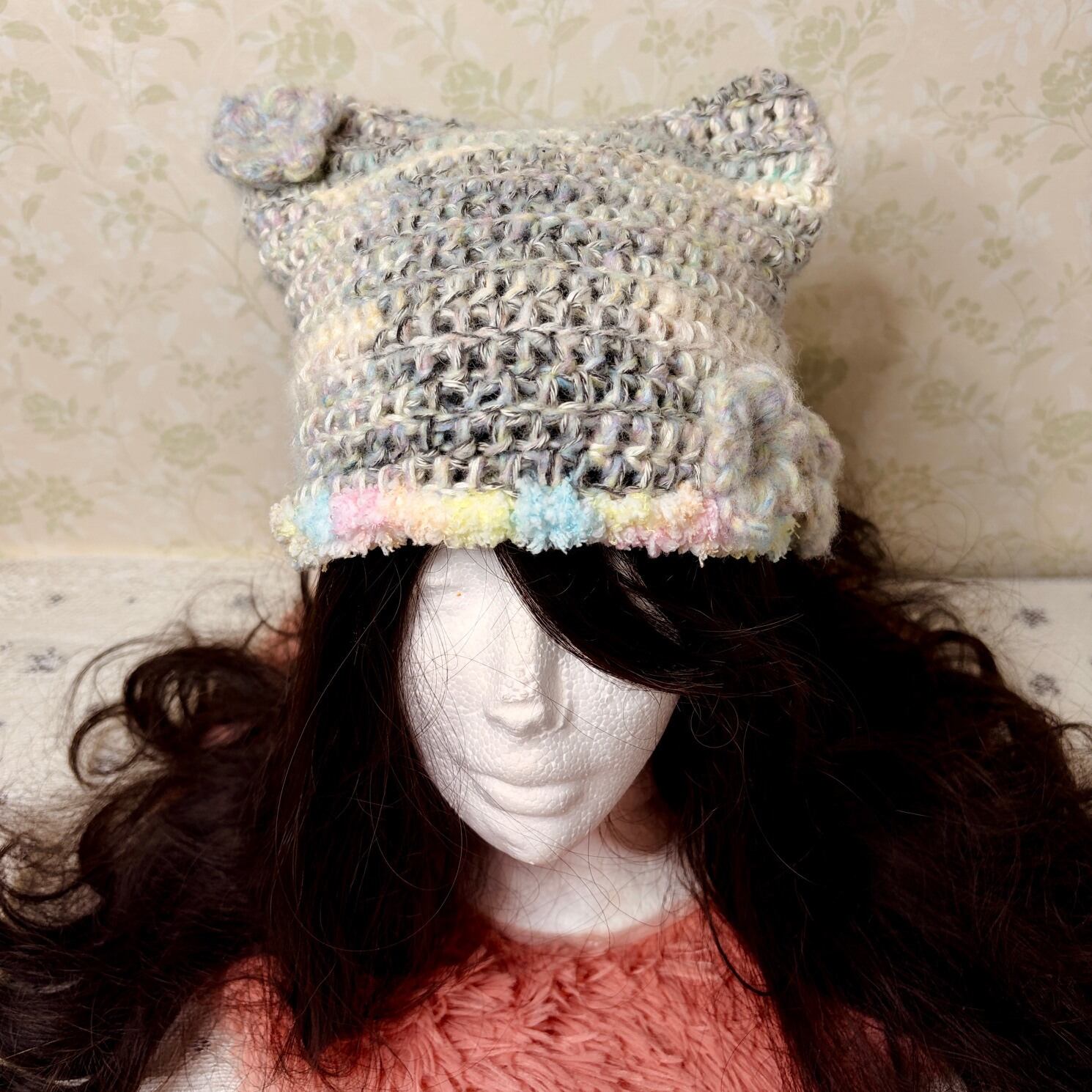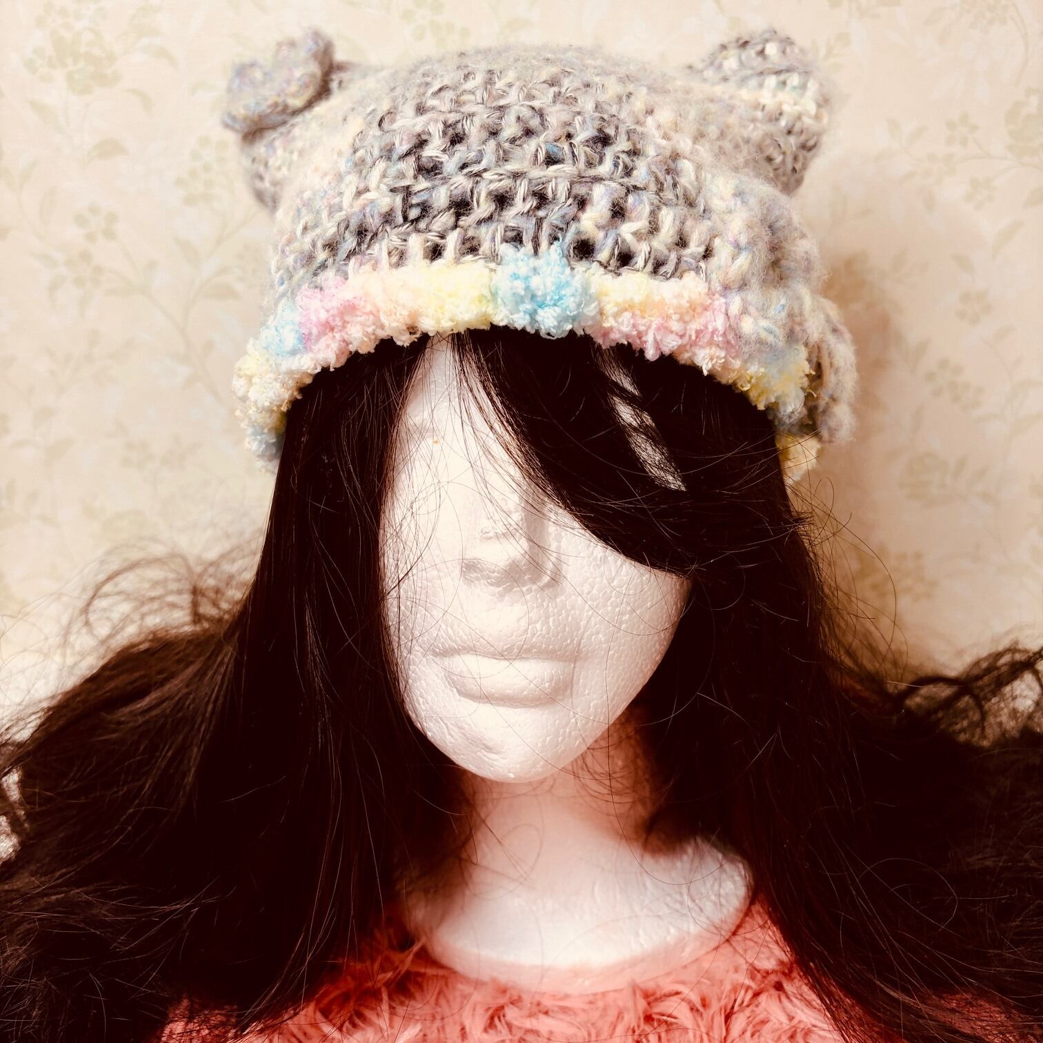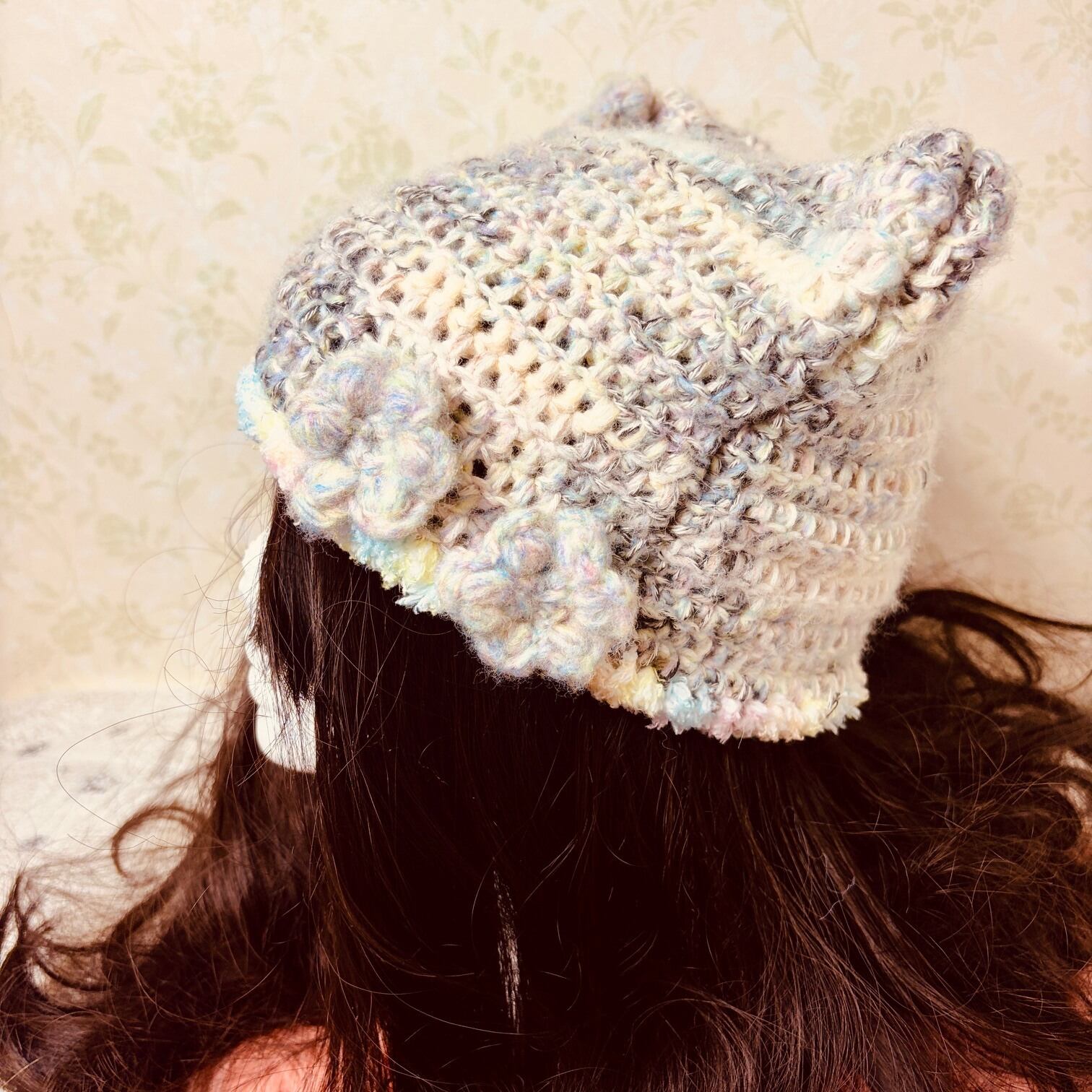 Handmade crochet rainbow cat ear beanie with rainbow fur and puffy flowers for winter or autumn for adults