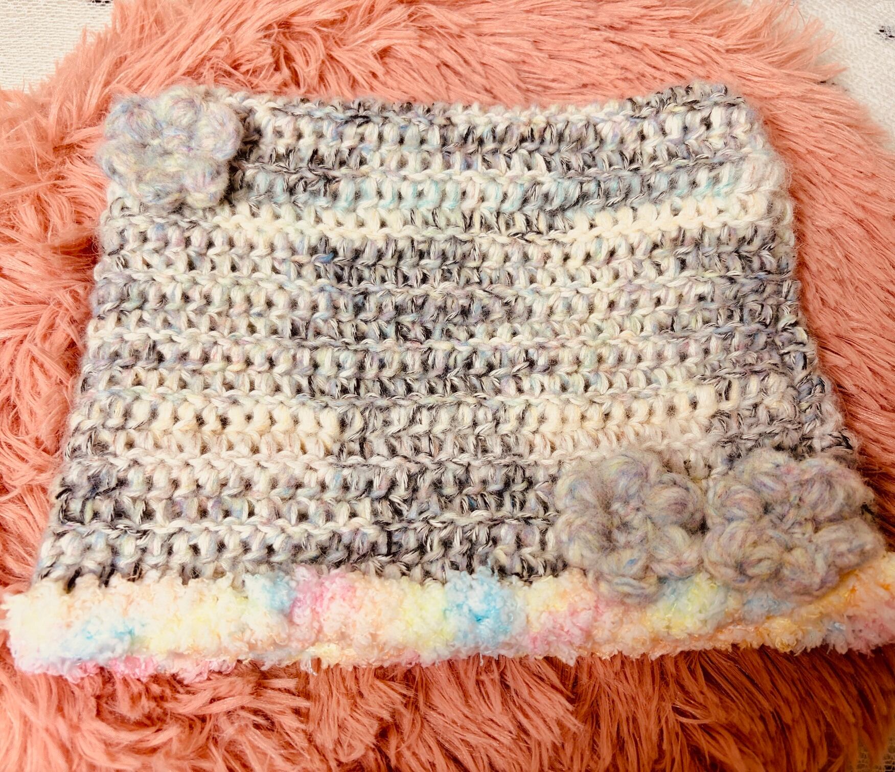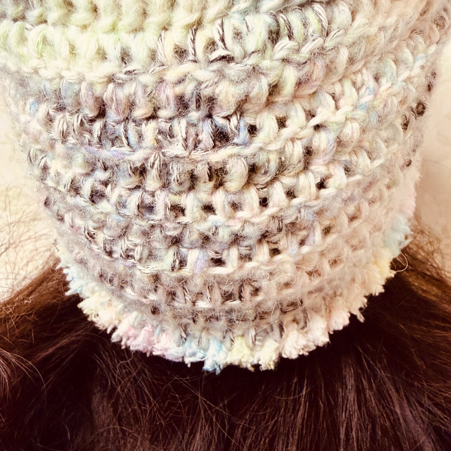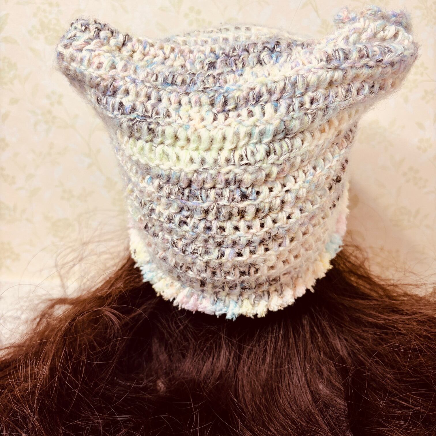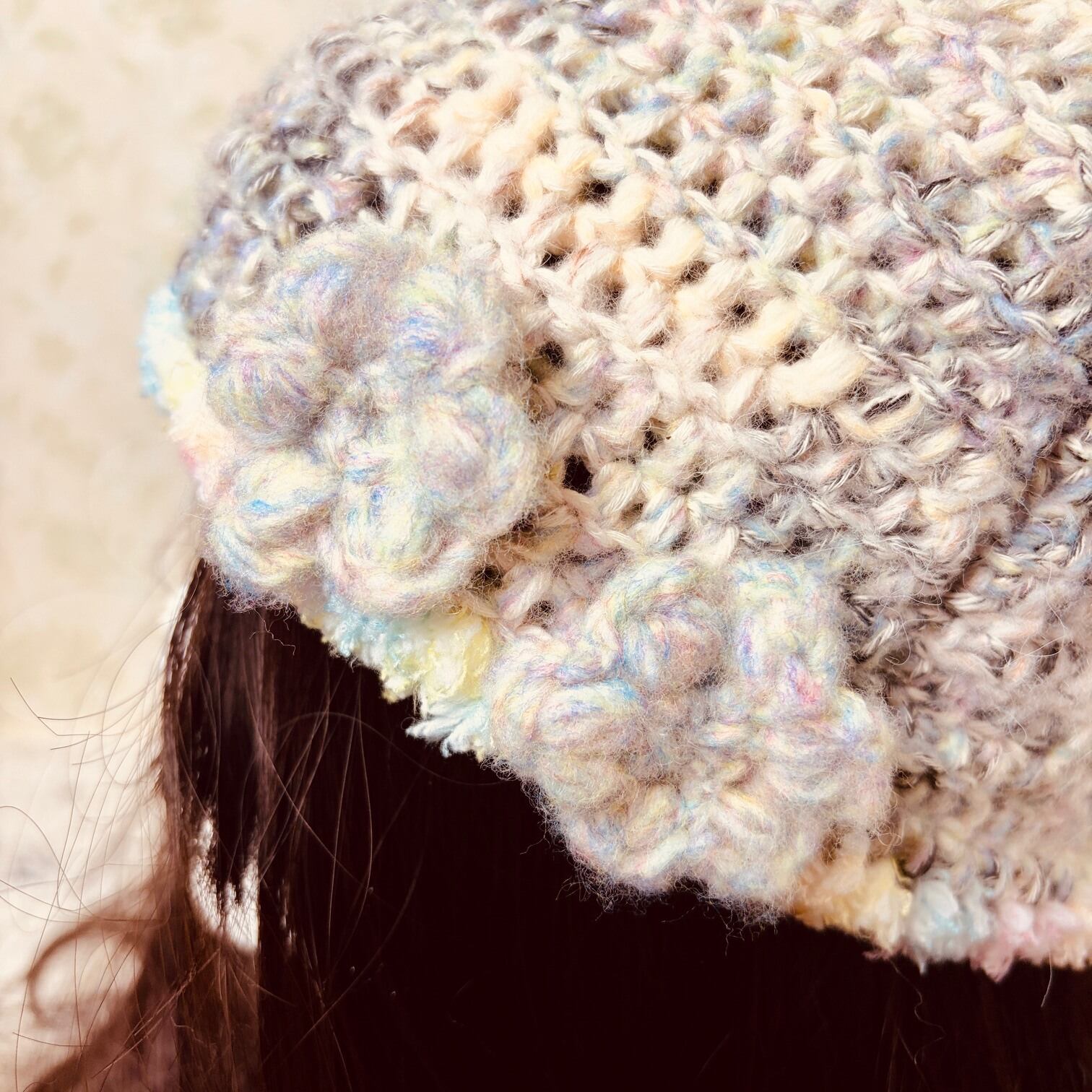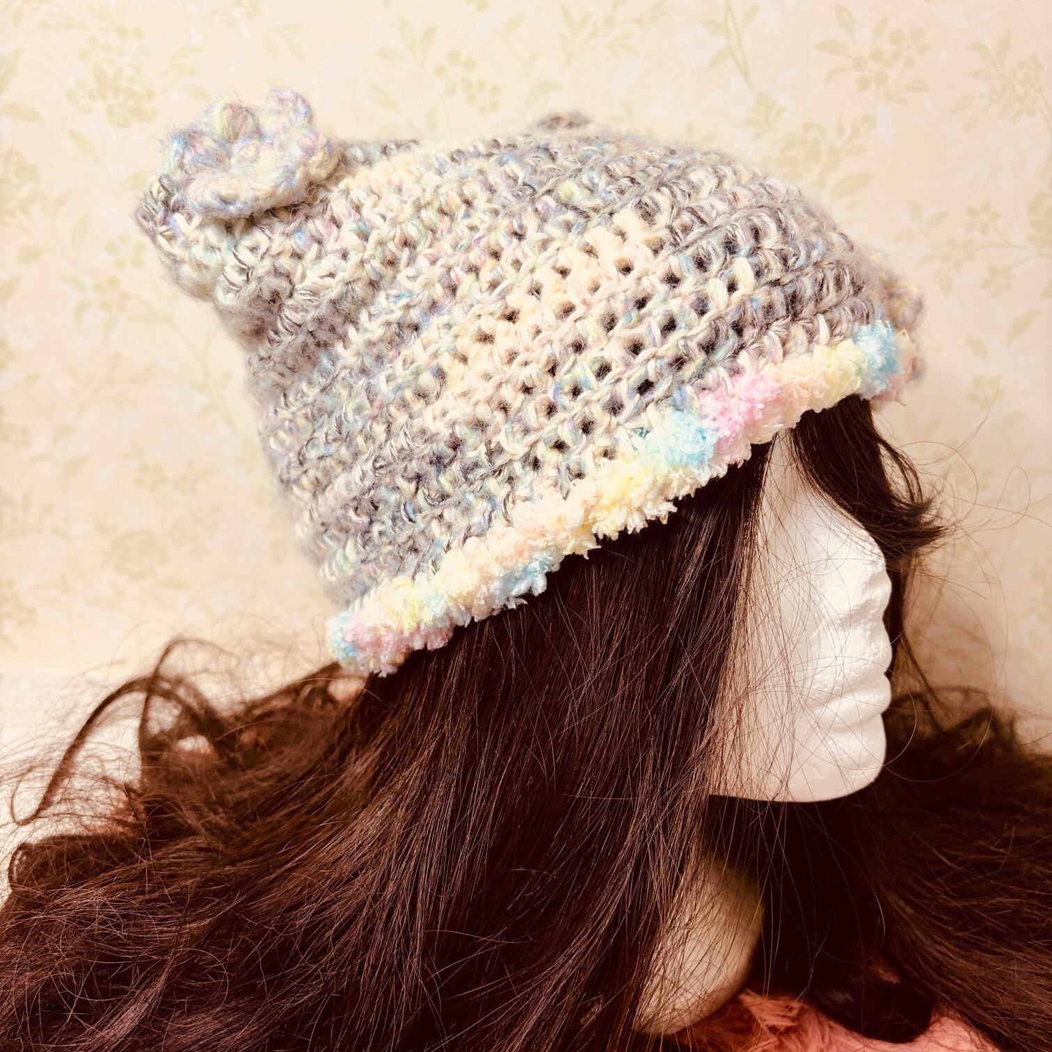 Handmade crochet rainbow cat ear beanie with rainbow fur and puffy flowers for winter or autumn for adults