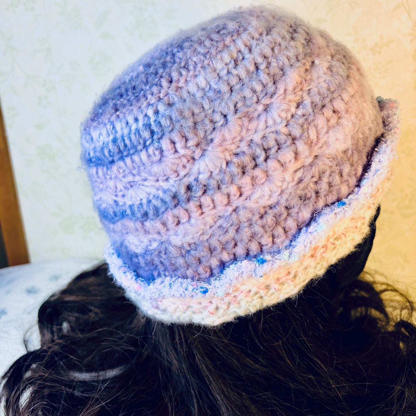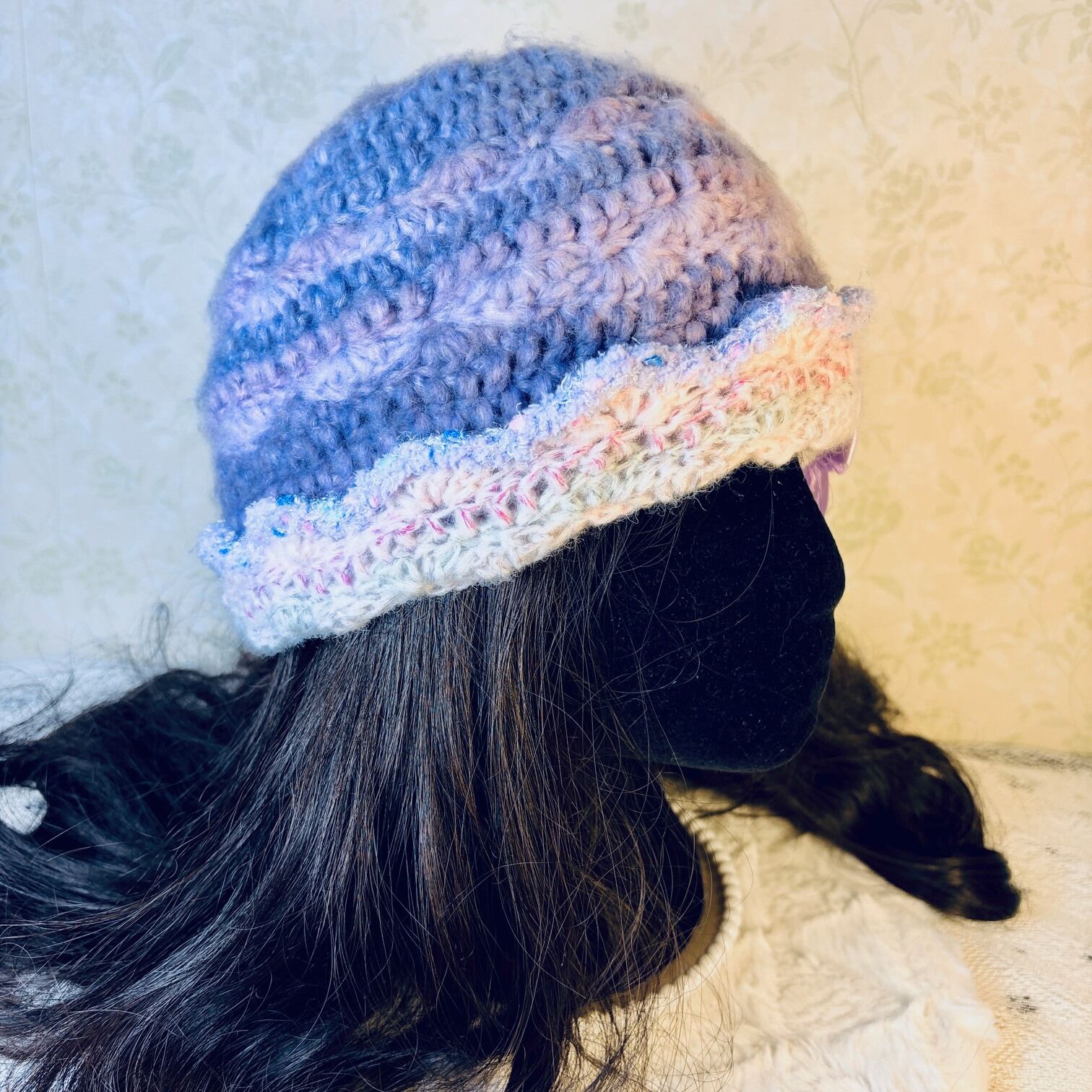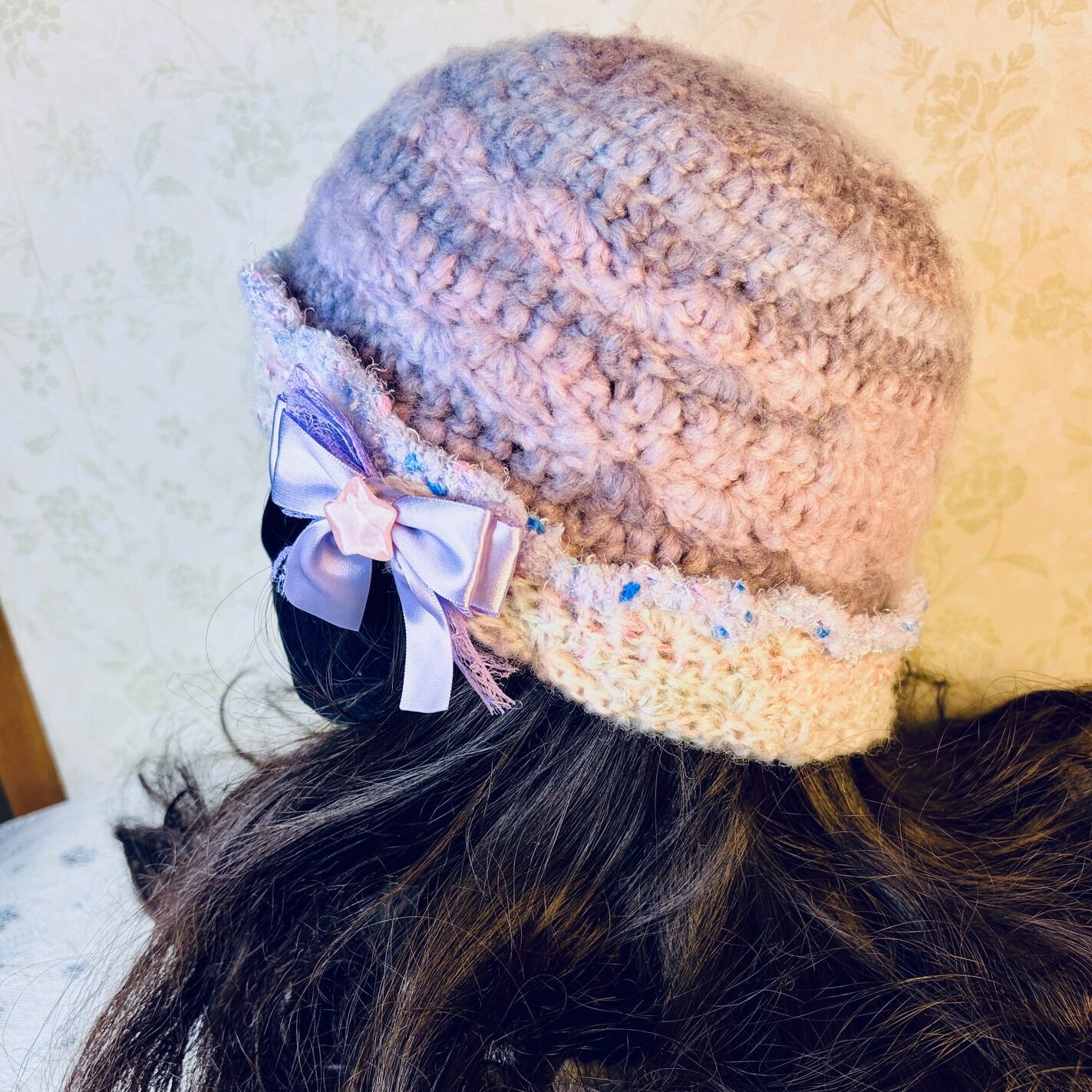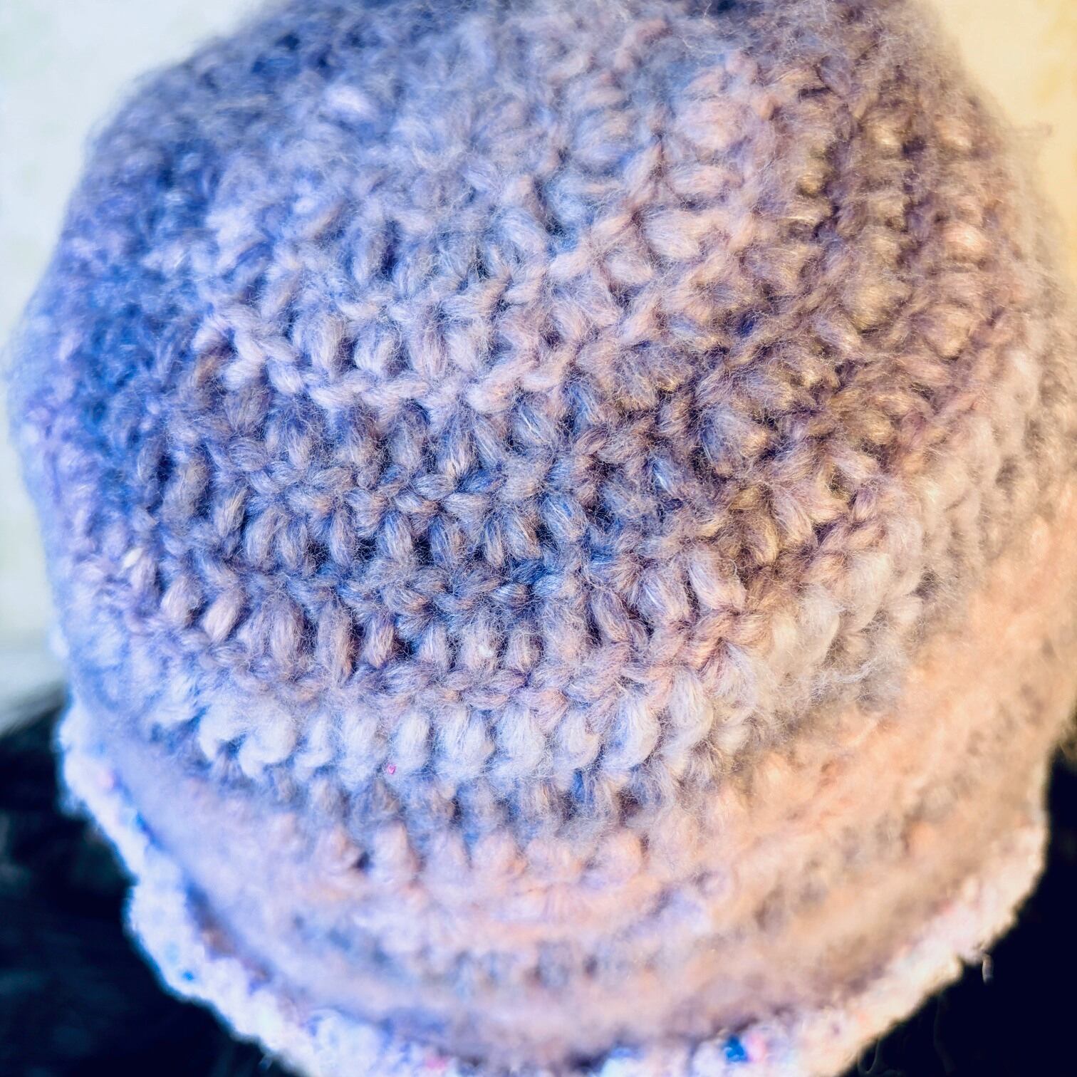 This handmade beanie hat features a soft, fluffy texture and a gentle pastel color palette.
