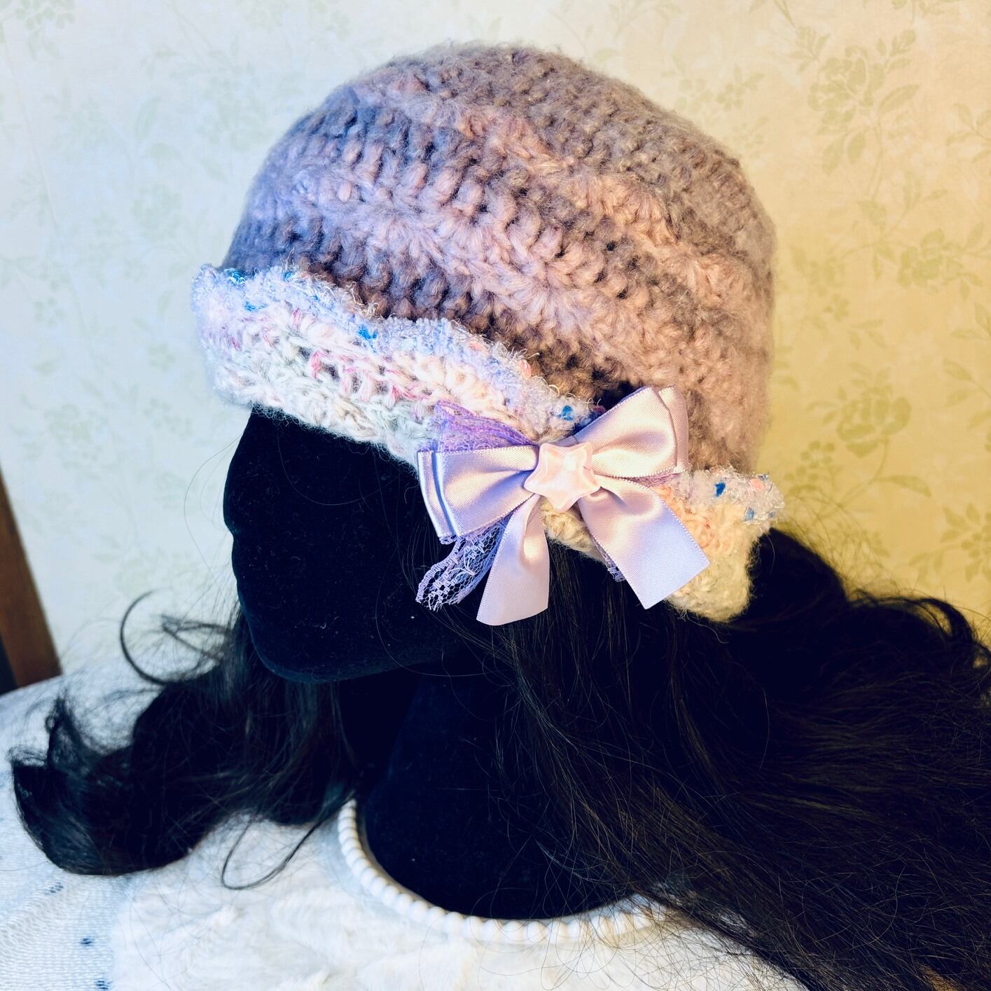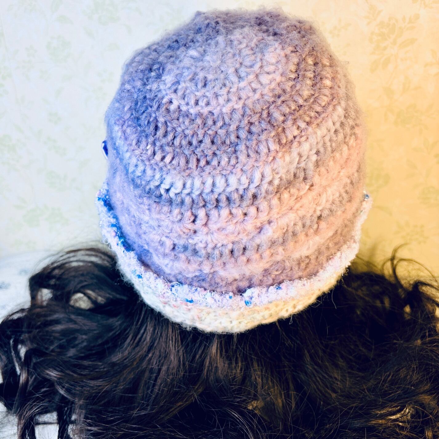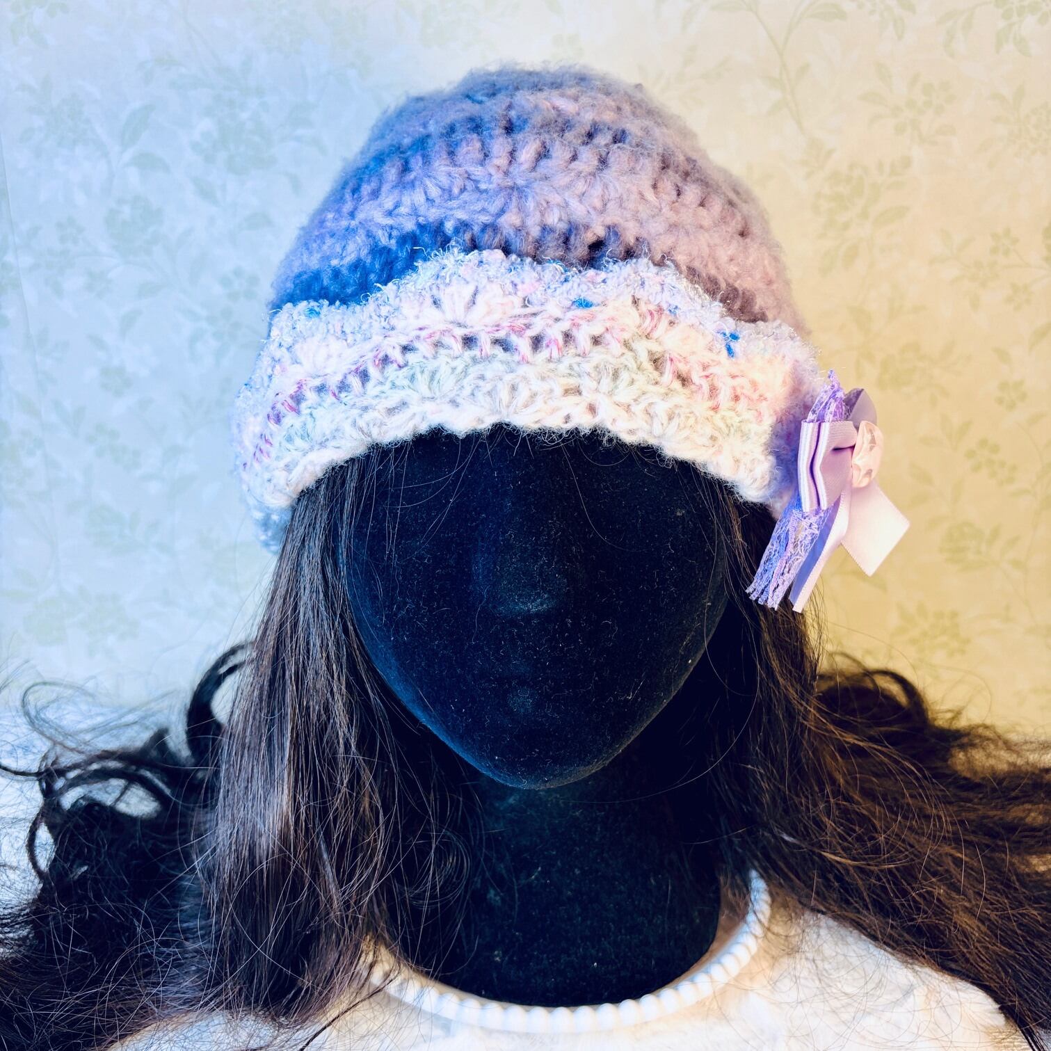 Soft Lavender Ribbon Crochet Beanie Hat with white border for winter