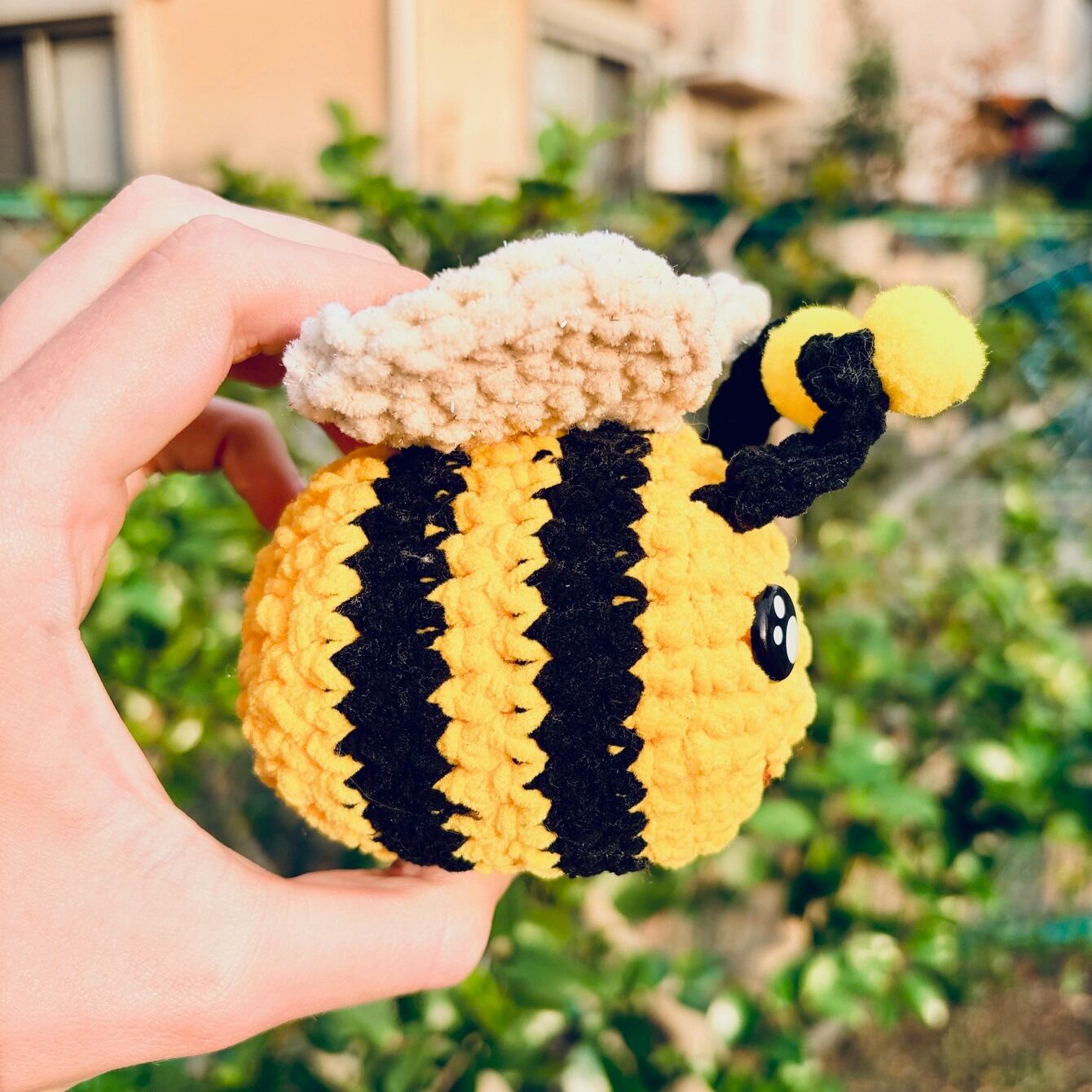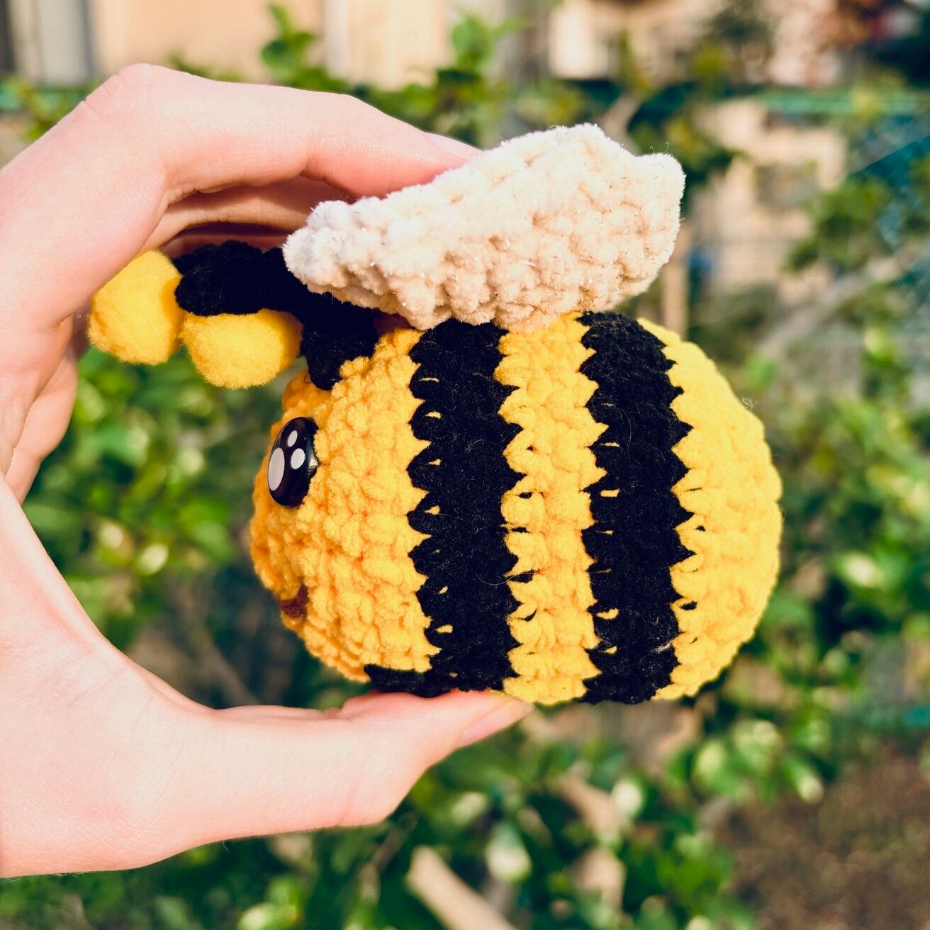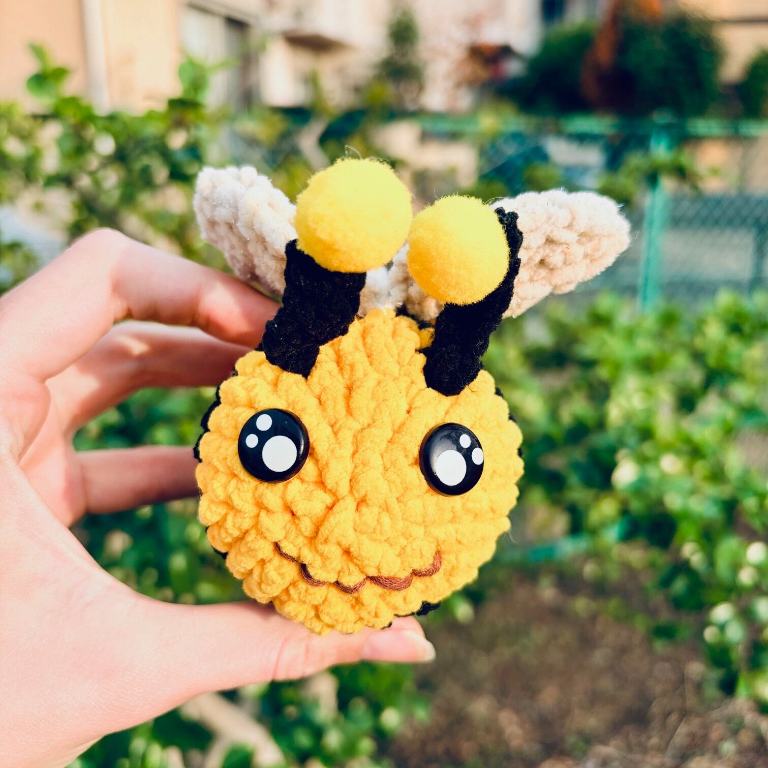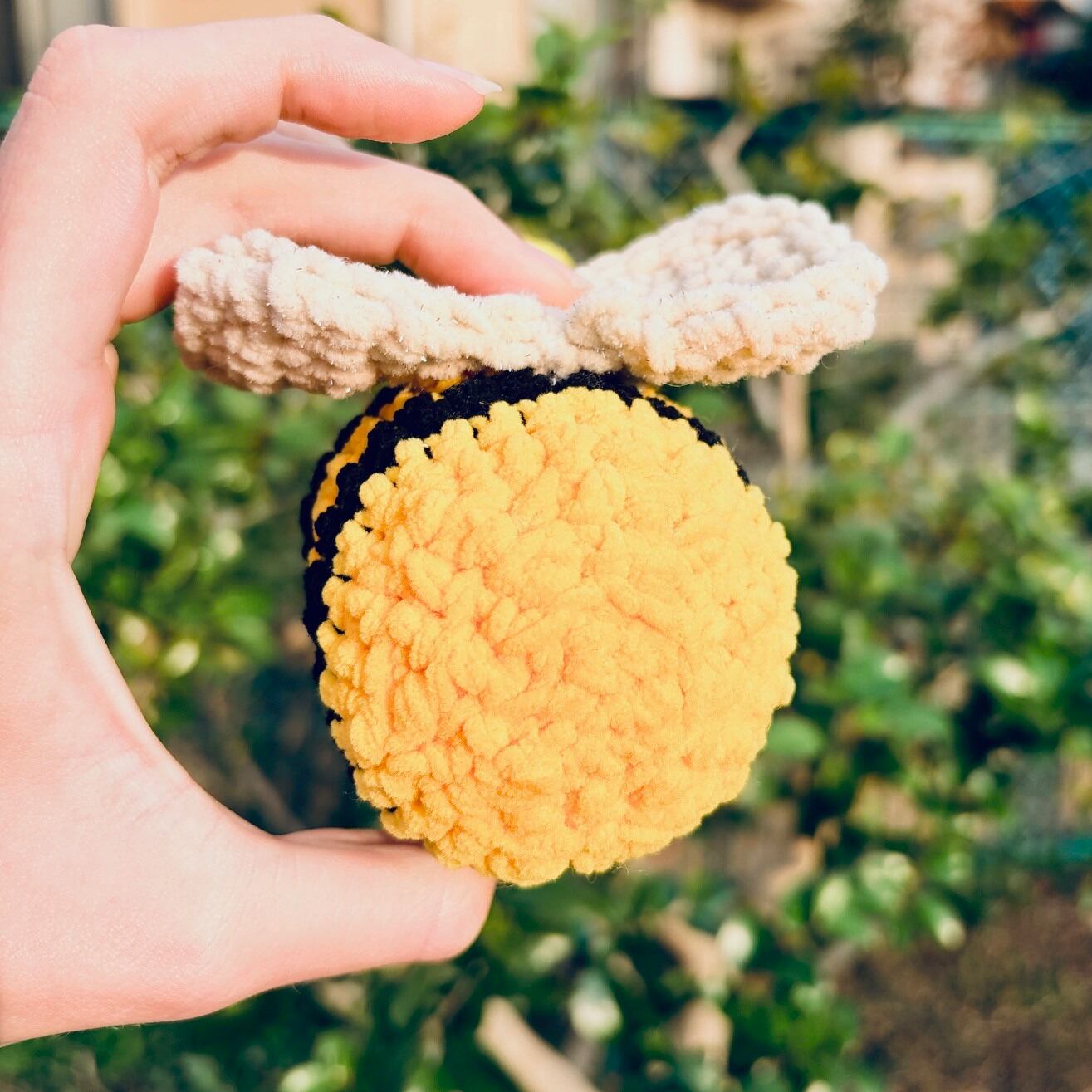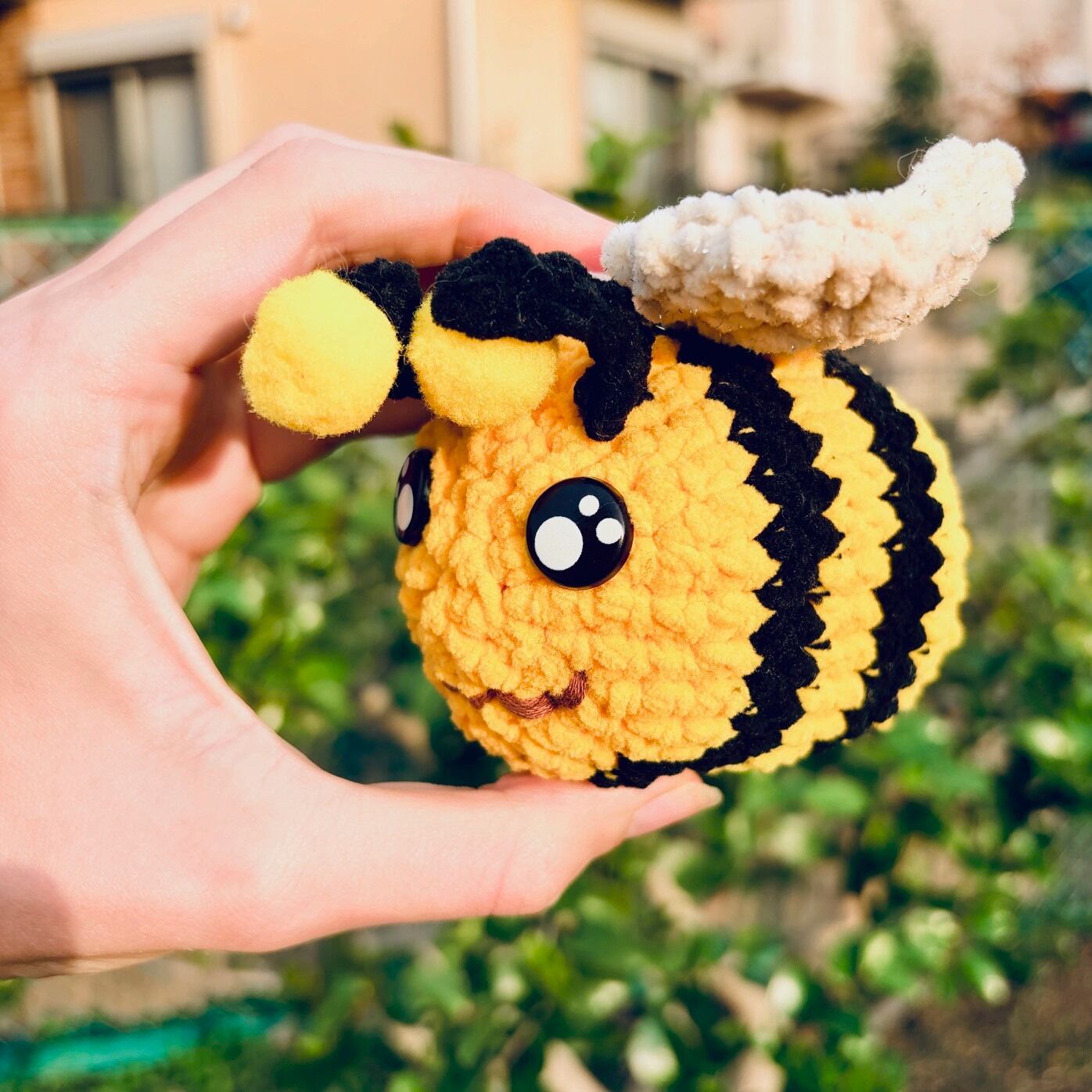 Lovingly handmade with soft, plush yarn, this little bee has a round shape and a sweet