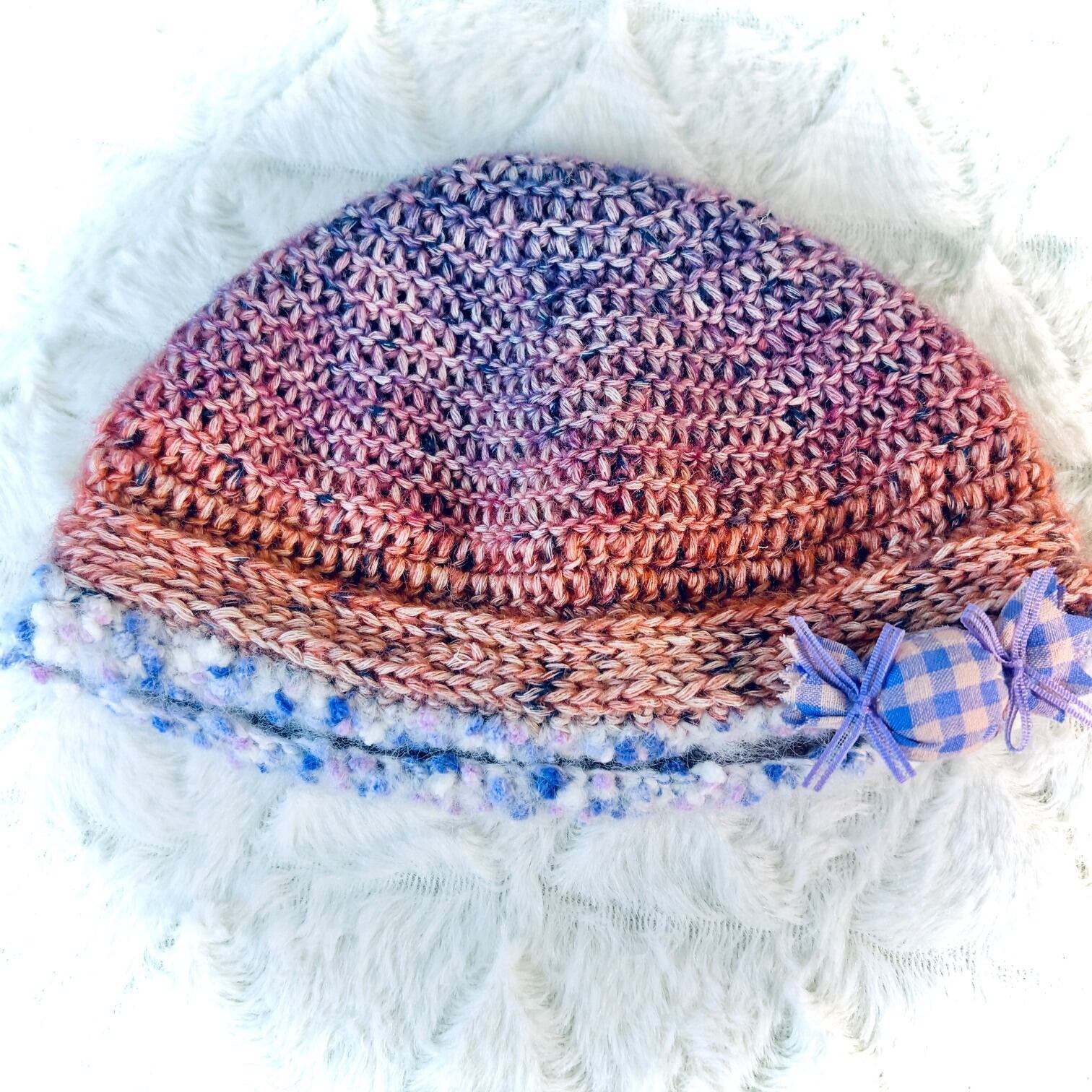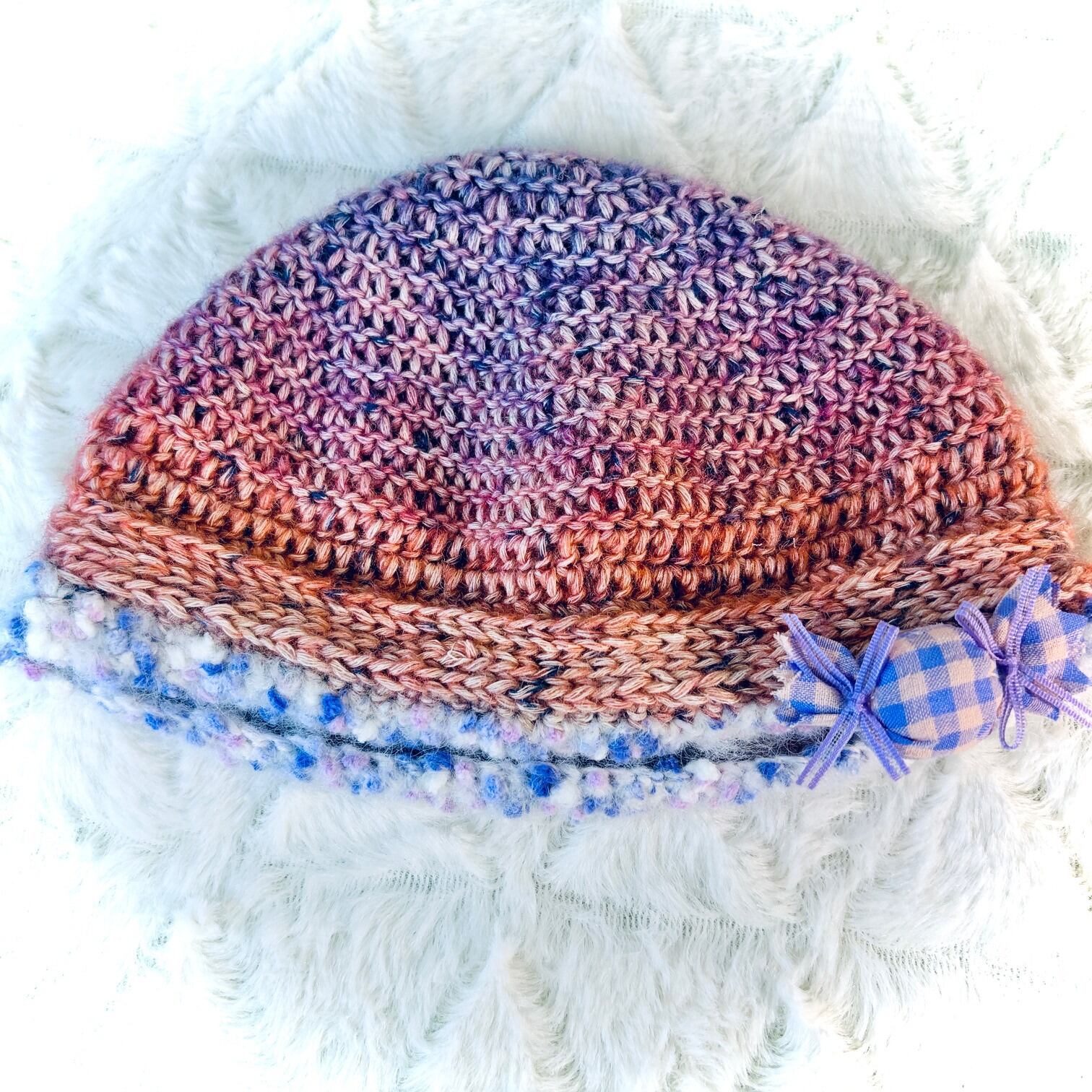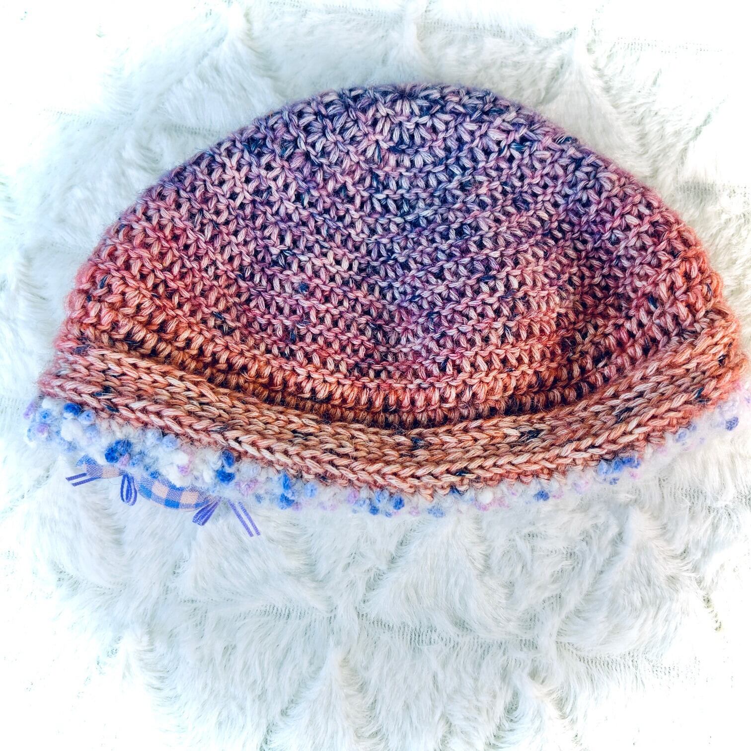 This handmade baby knit hat is crocheted with beautifully watercolor yarn, creating a gentle pink-to-purple gradient that adds a soft and charming look to any baby outfit.