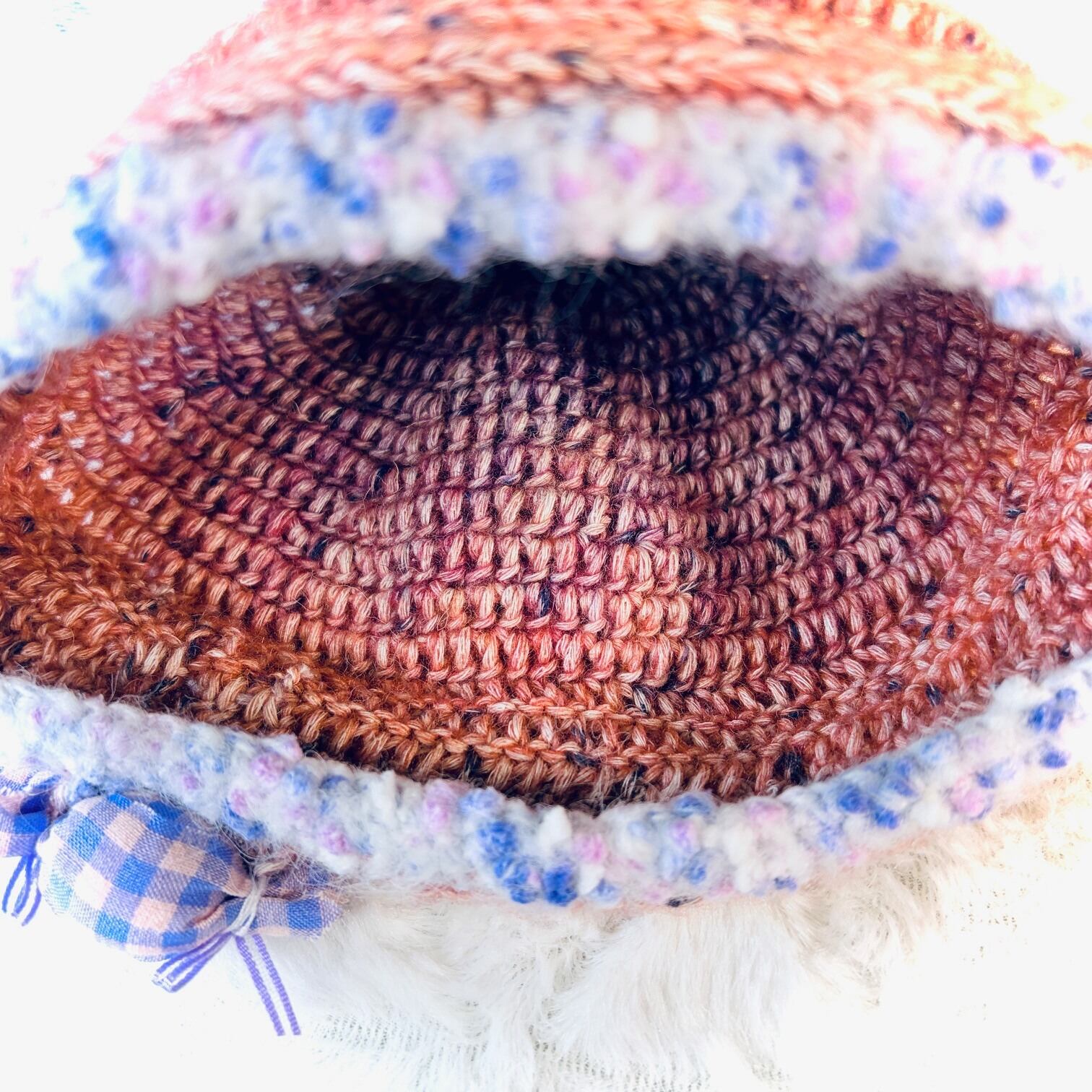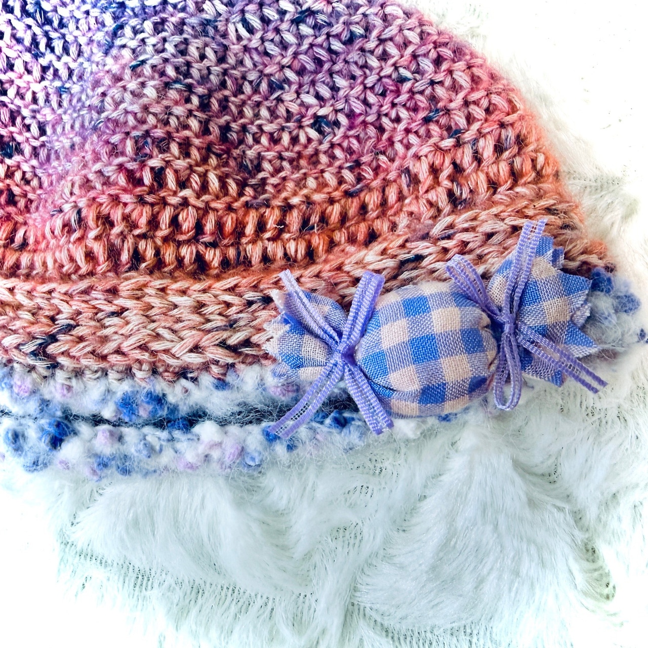 The brim is accented with fluffy fancy yarn for extra texture, and a cute gingham candy-shaped fabric decoration gives the hat a sweet, cozy finish.