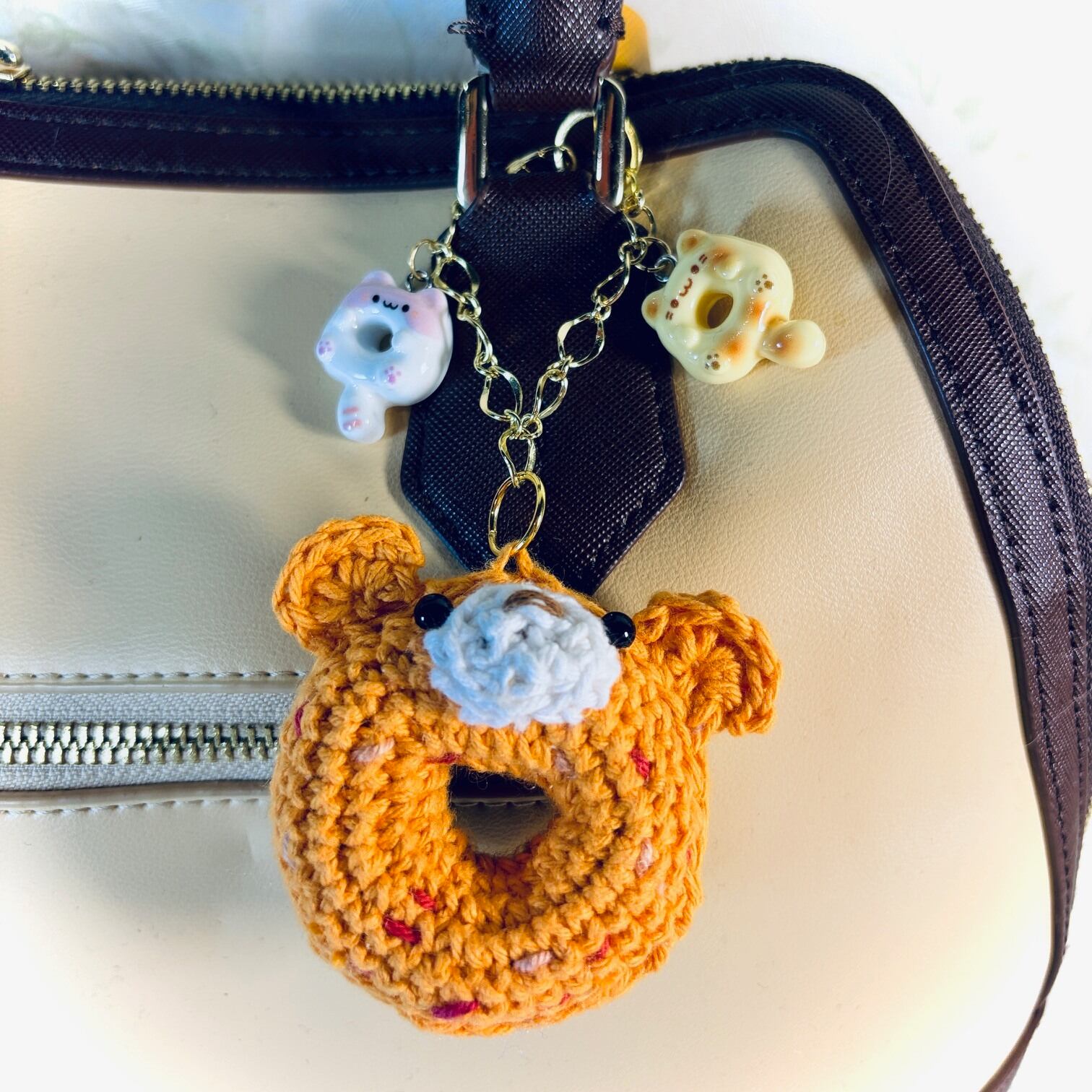 This adorable hand-crocheted bear donut bag charm is the perfect accessory to add a