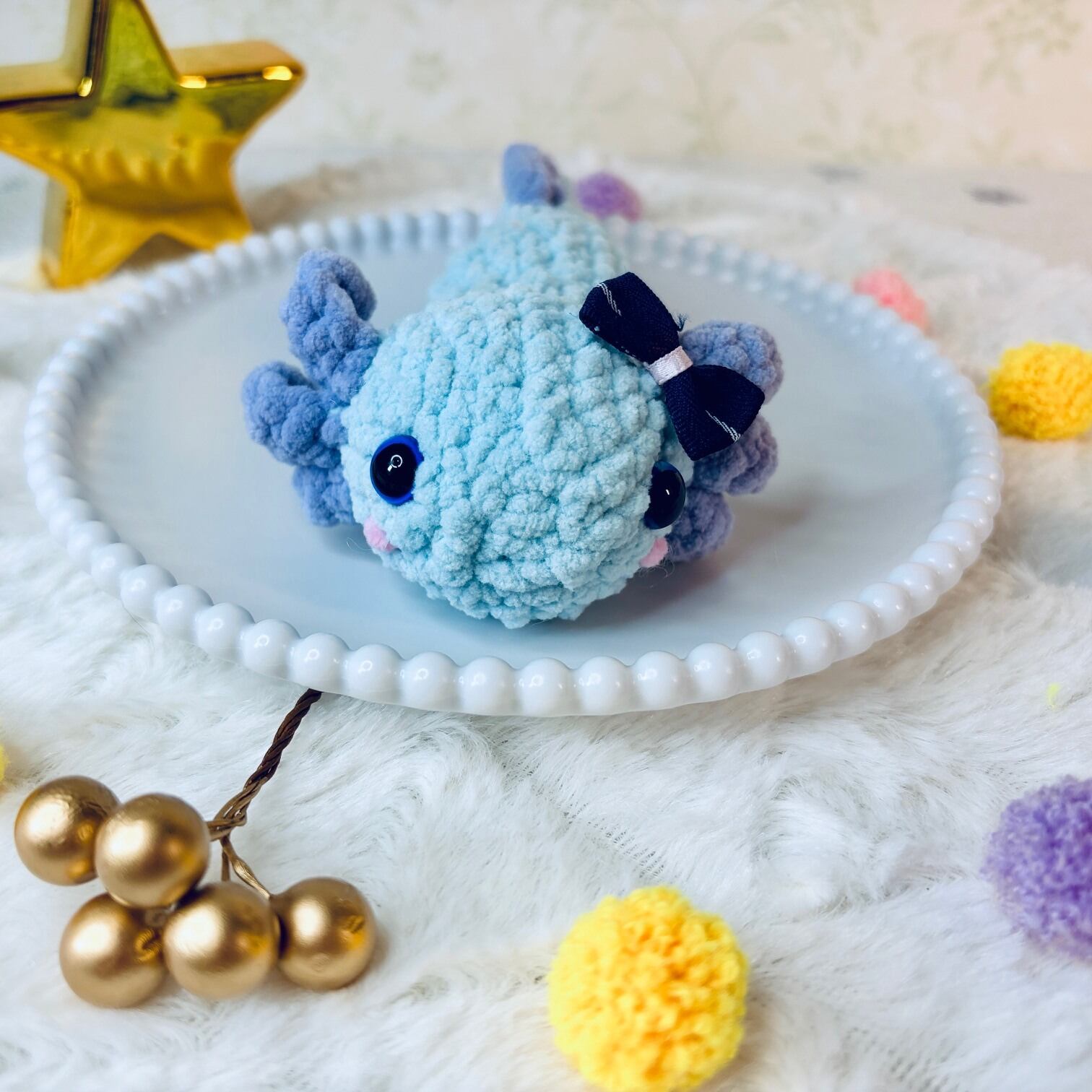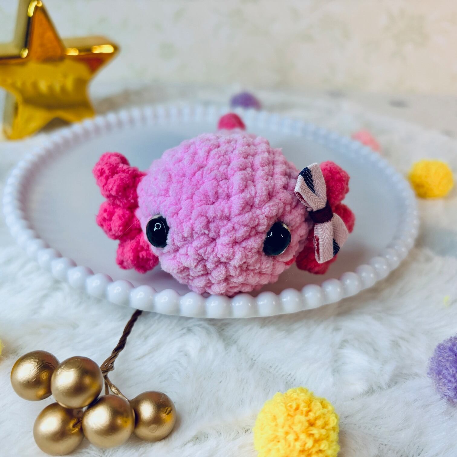 This adorable handmade axolotl amigurumi plush is crocheted with soft, fluffy yarn, giving it a wonderfully cozy and squishy texture.