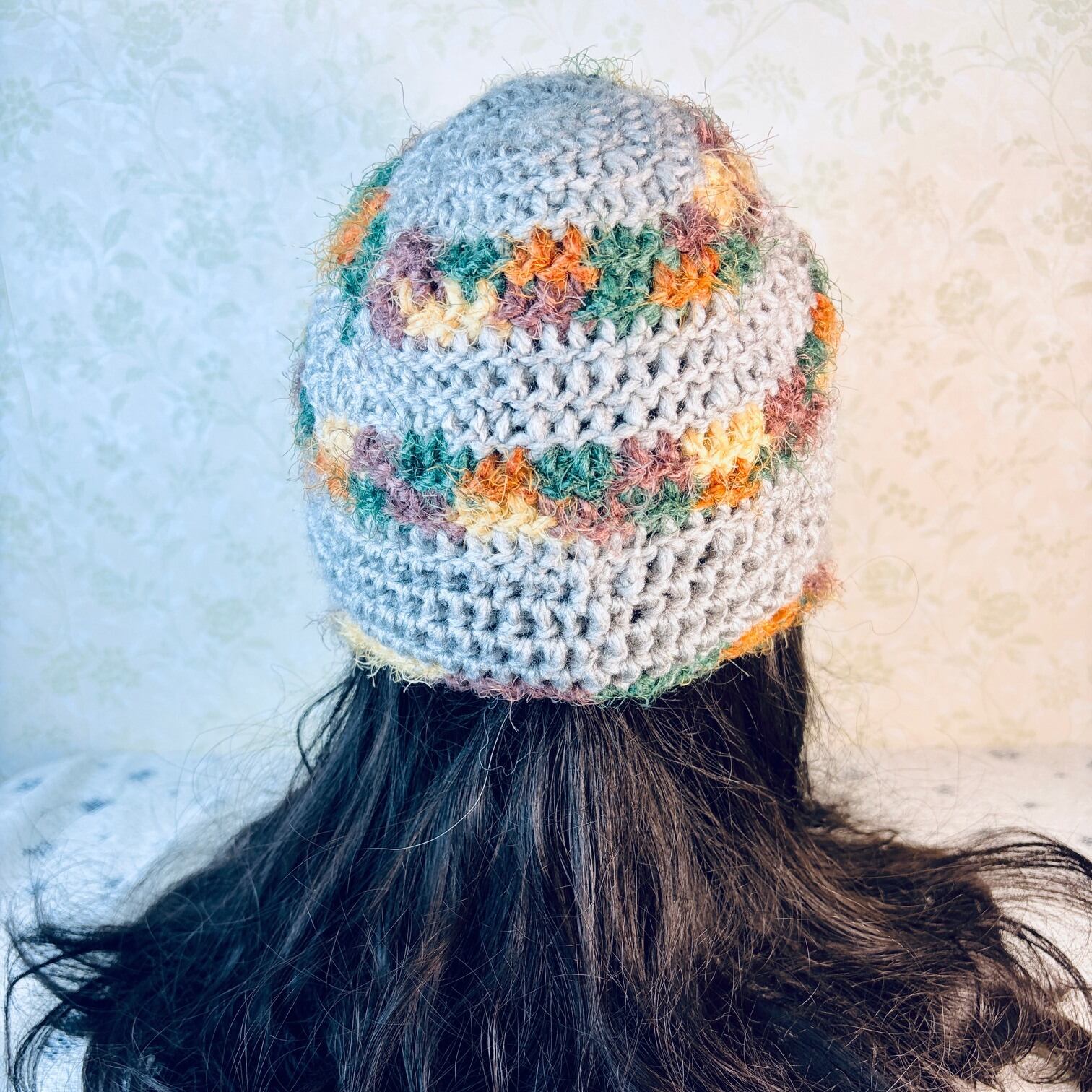 The gentle gray base combined with fluffy autumn-toned yarn creates a charming Nordic-style look that’s perfect for everyday wear.