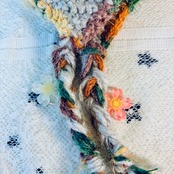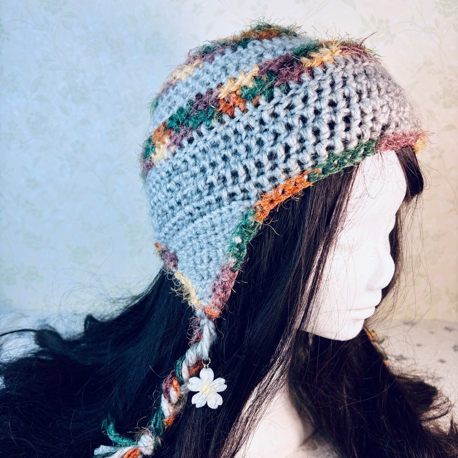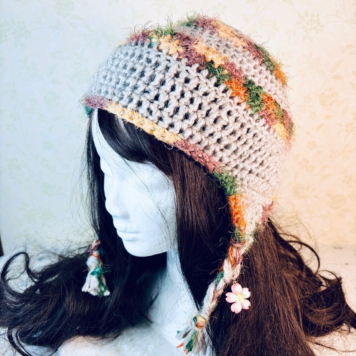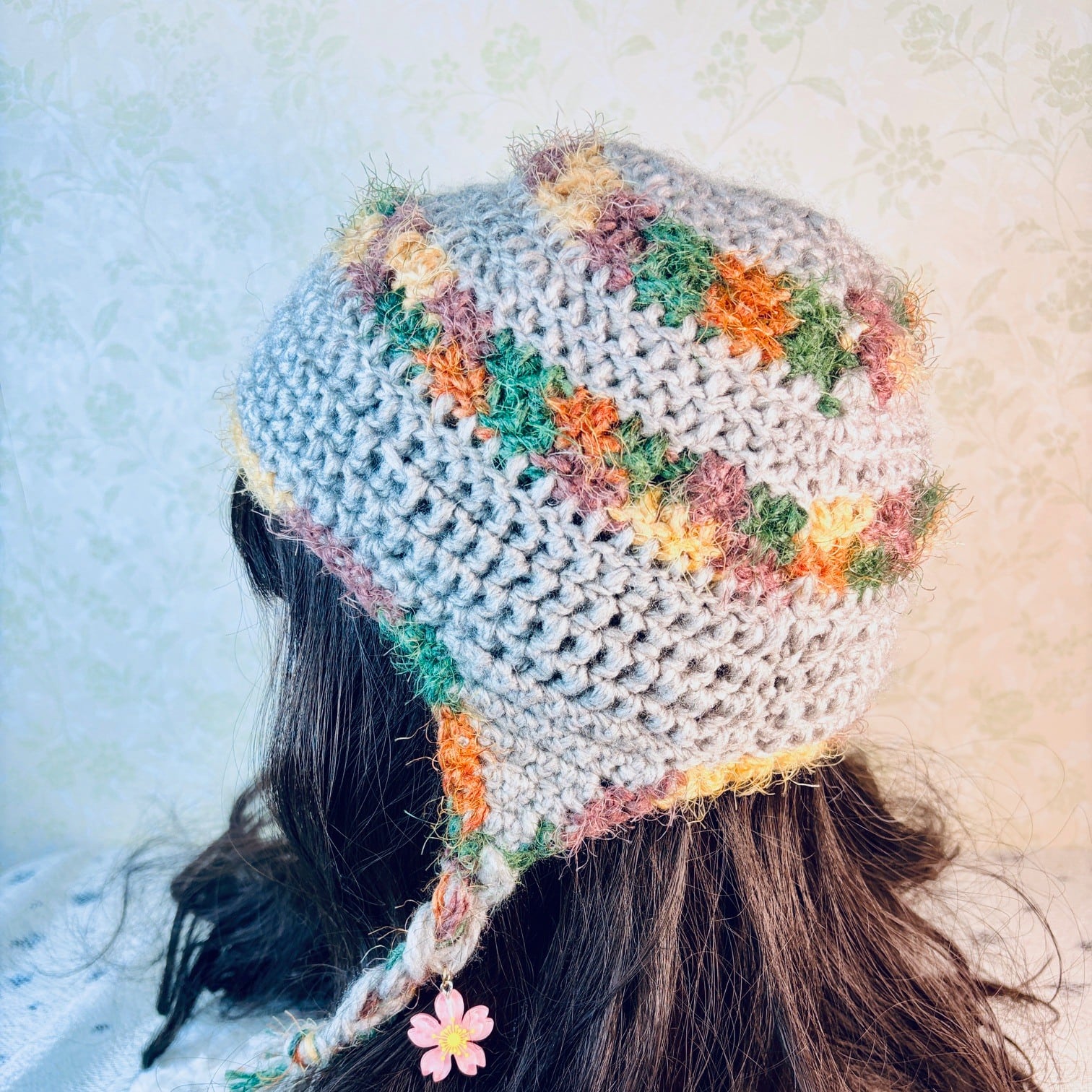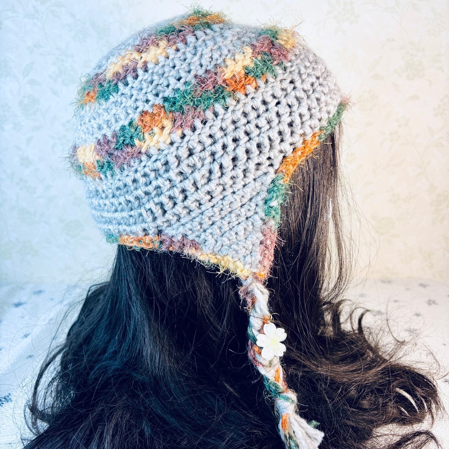 The braided ties with cute floral accents add a playful touch, enhancing the hat’s unique handmade charm.