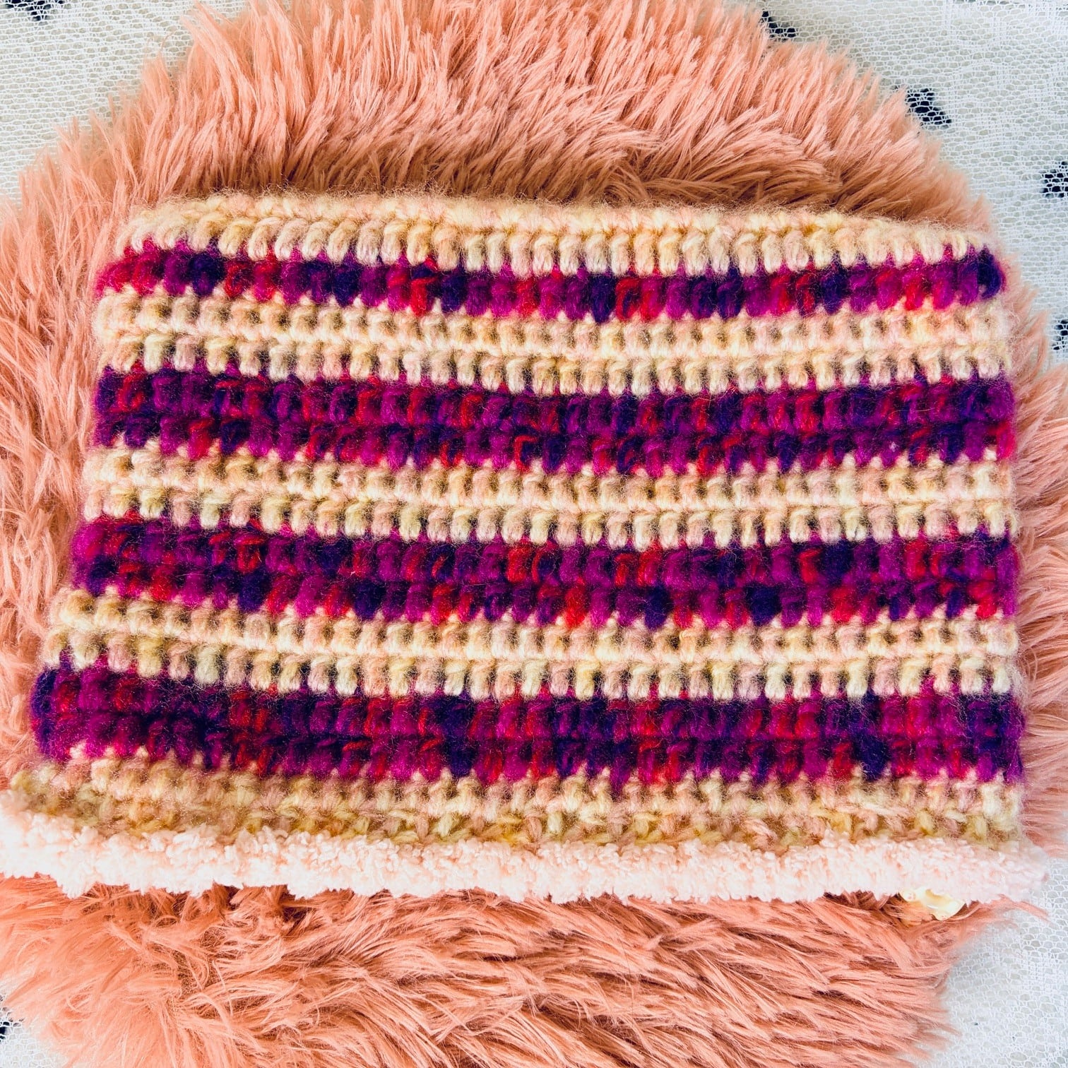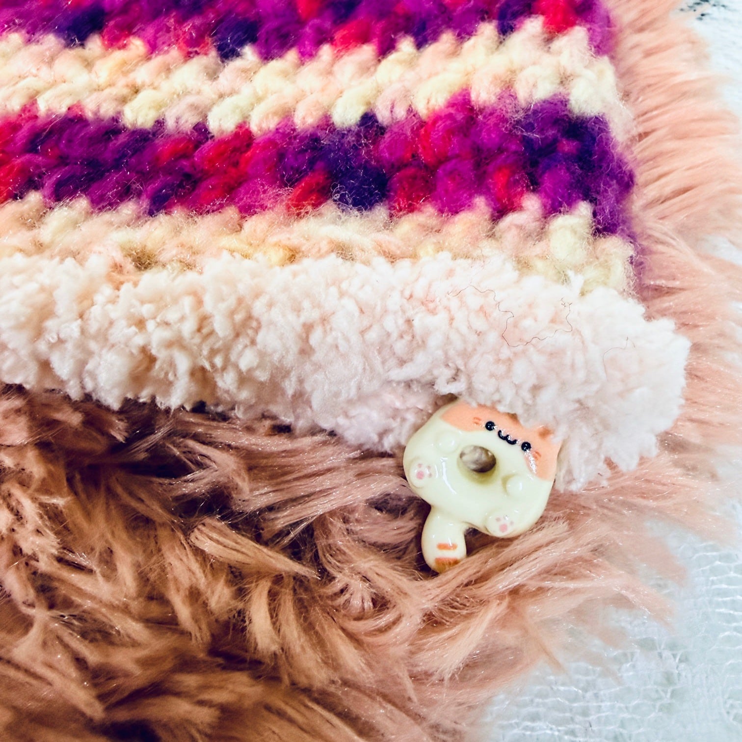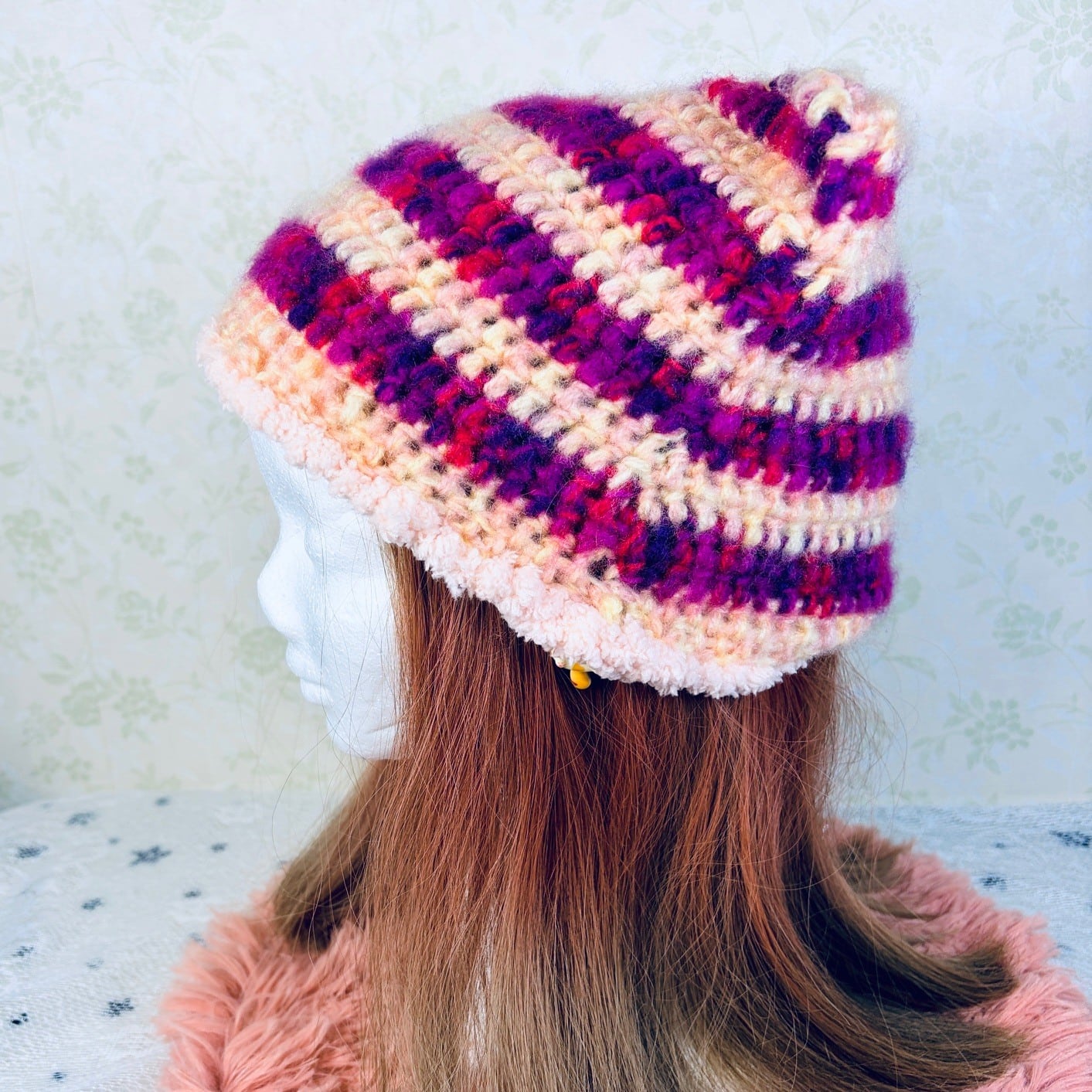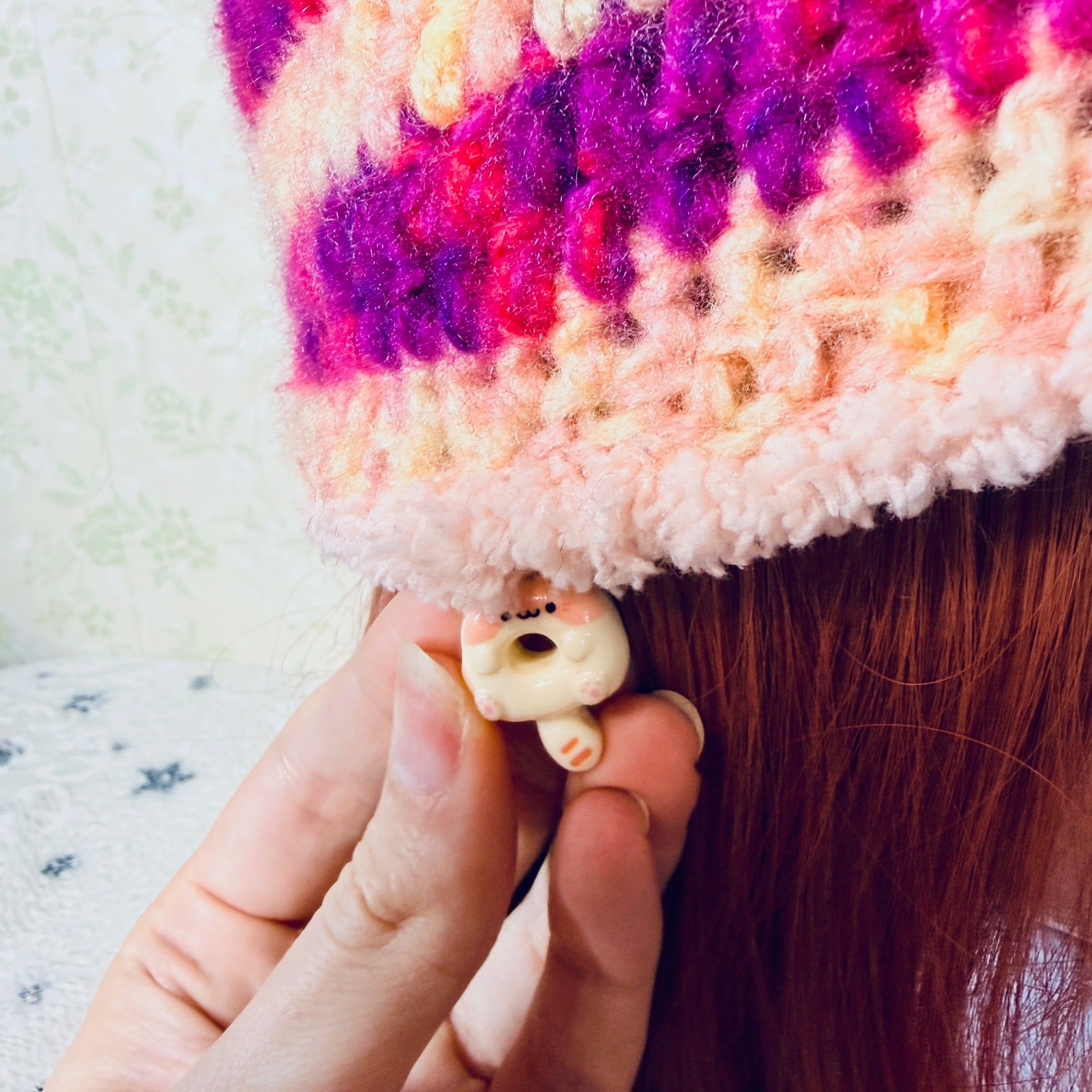 Hand-crocheted Kids Cat Ear Hat with Donut Cat Charms | Colorful Striped Handmade Winter Beanie for Children