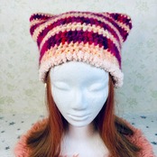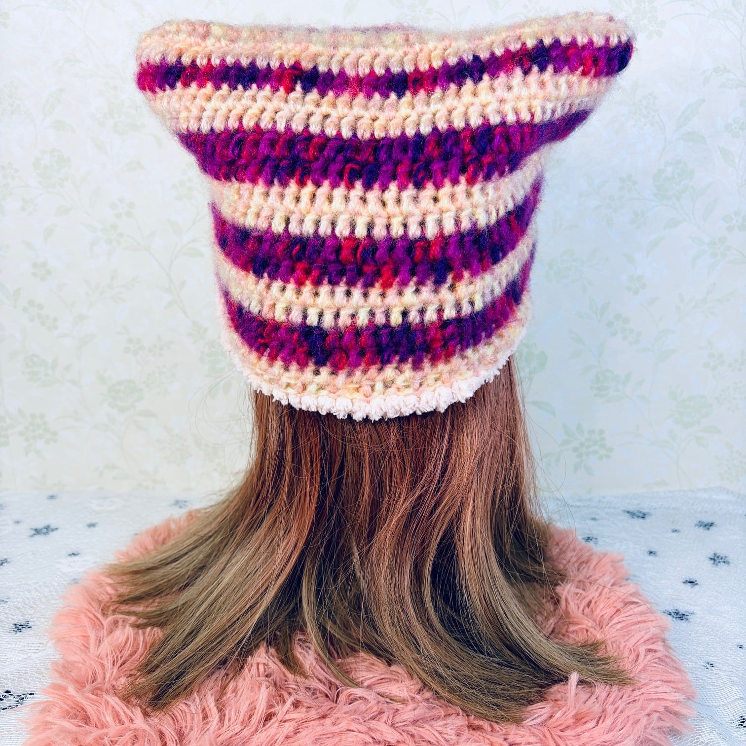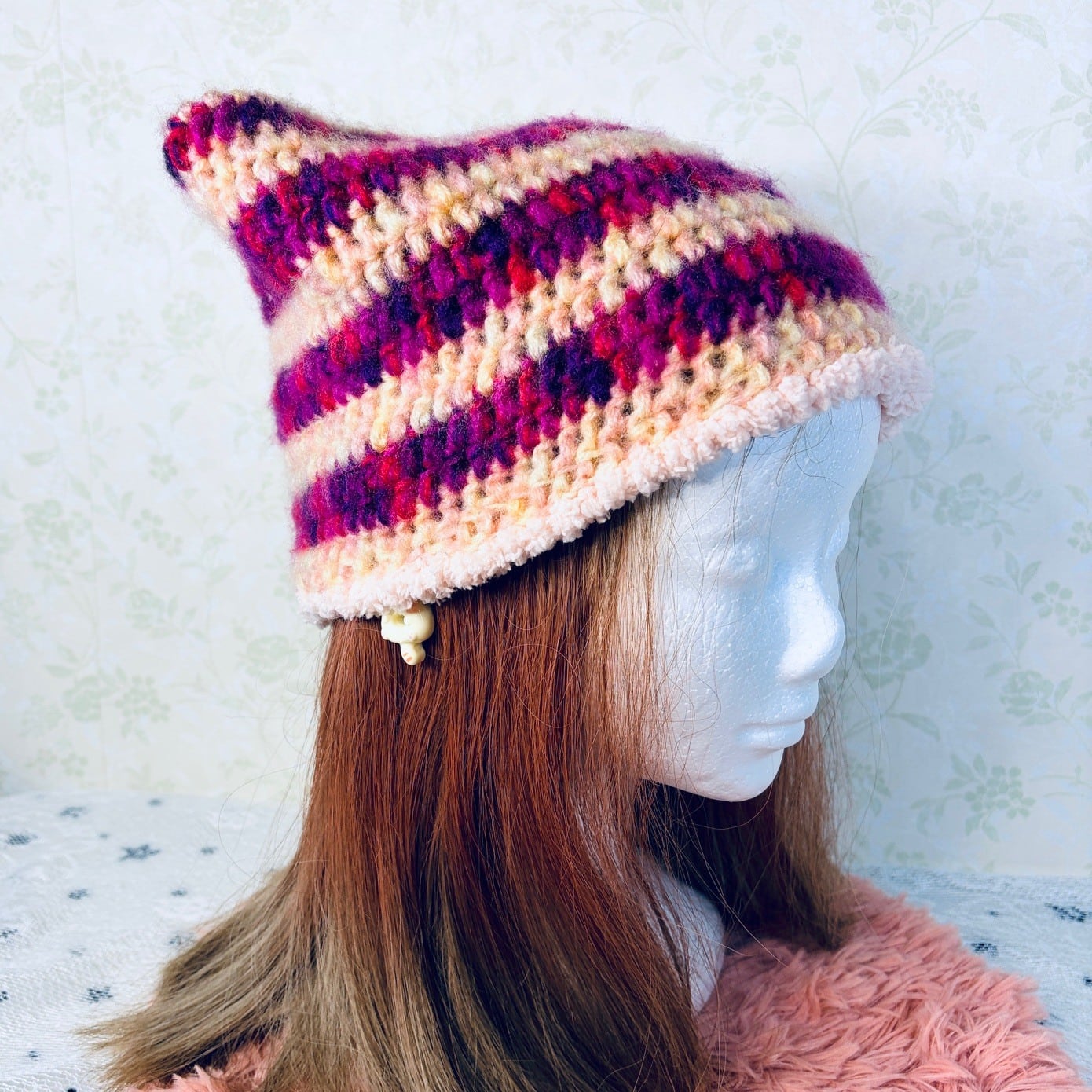 This adorable hand-knitted kids cat ear hat features colorful striped patterns and cute pointed cat ears, making it a fun and eye-catching accessory for children.