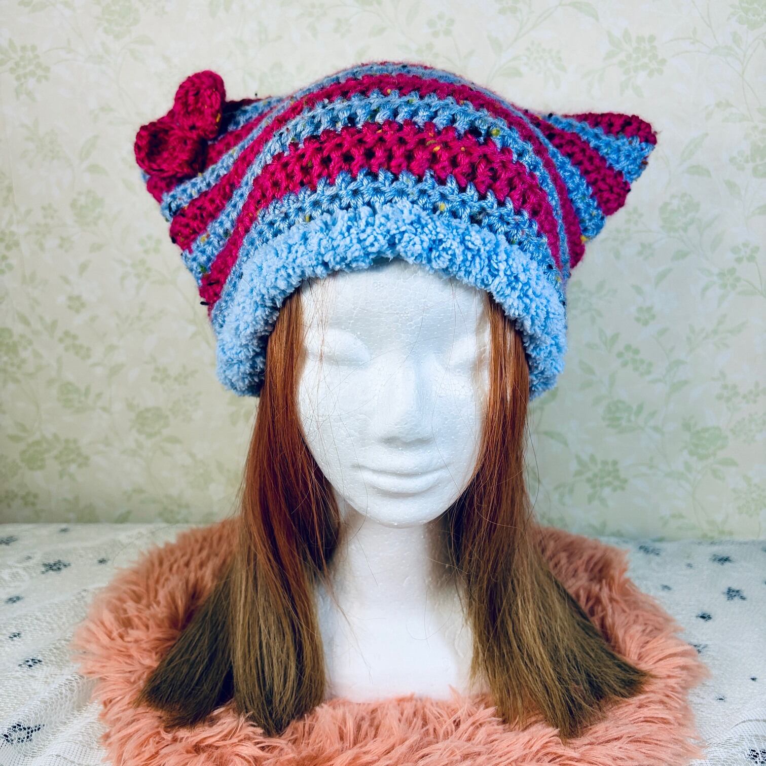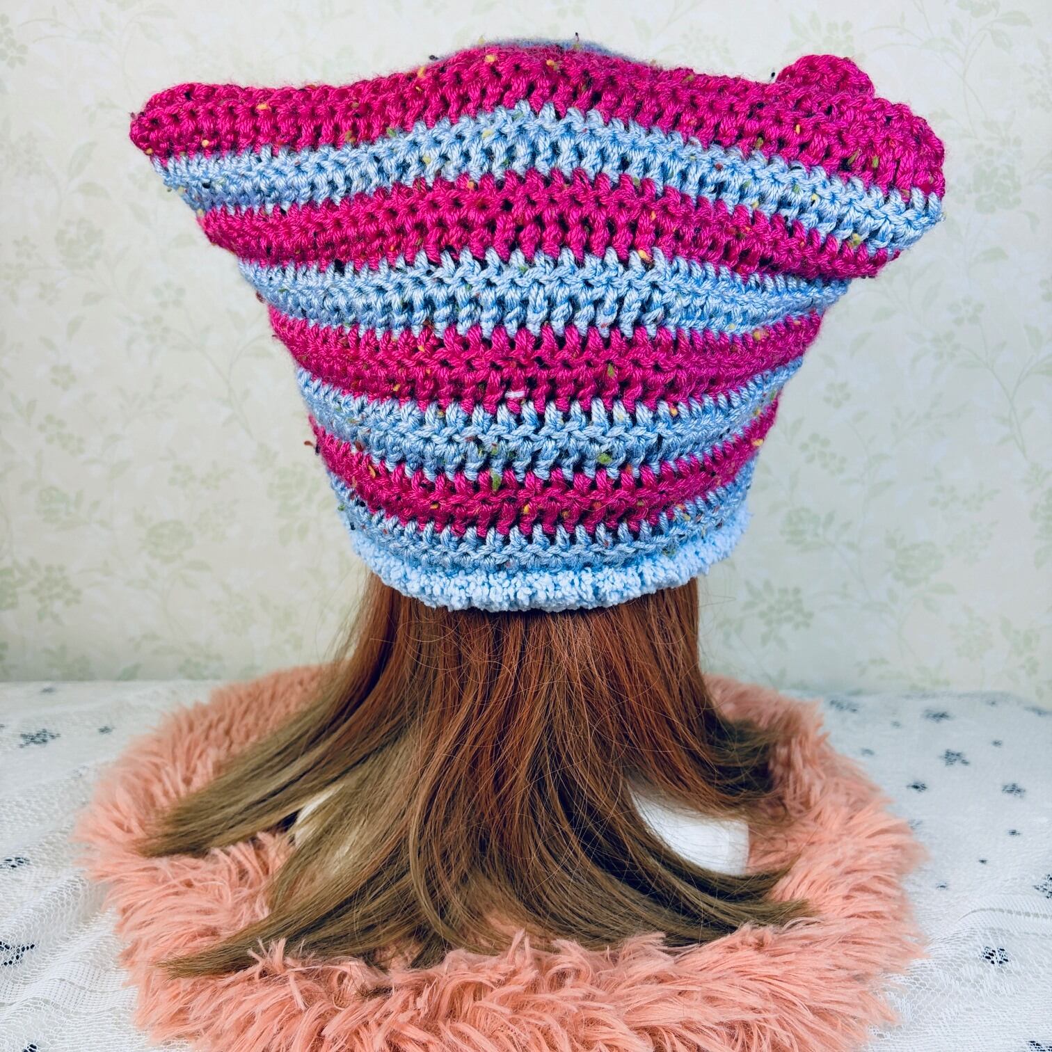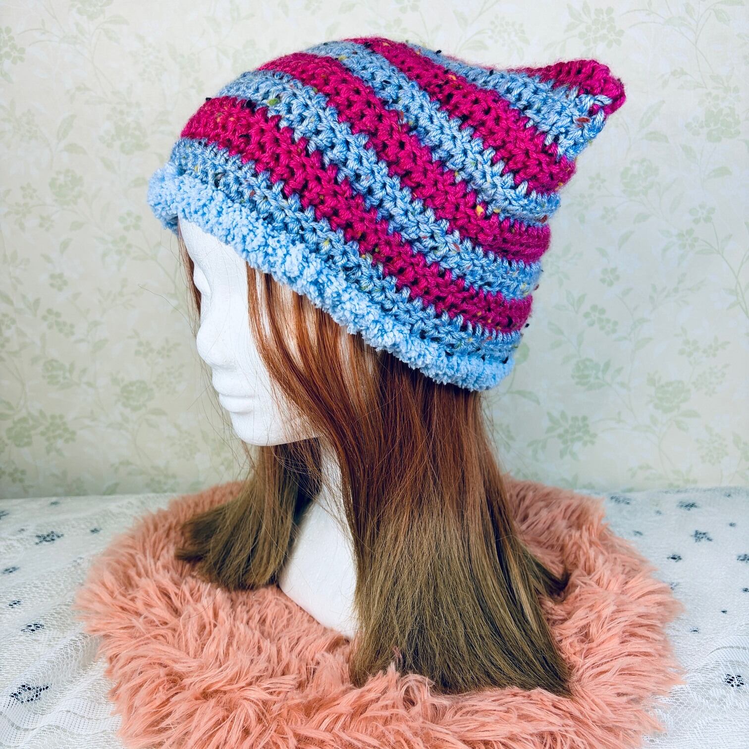 Adult Cat Ear Crochet Hat – Handmade with Holiday Tweed Yarn – Unique Design in pink and blue stripes
