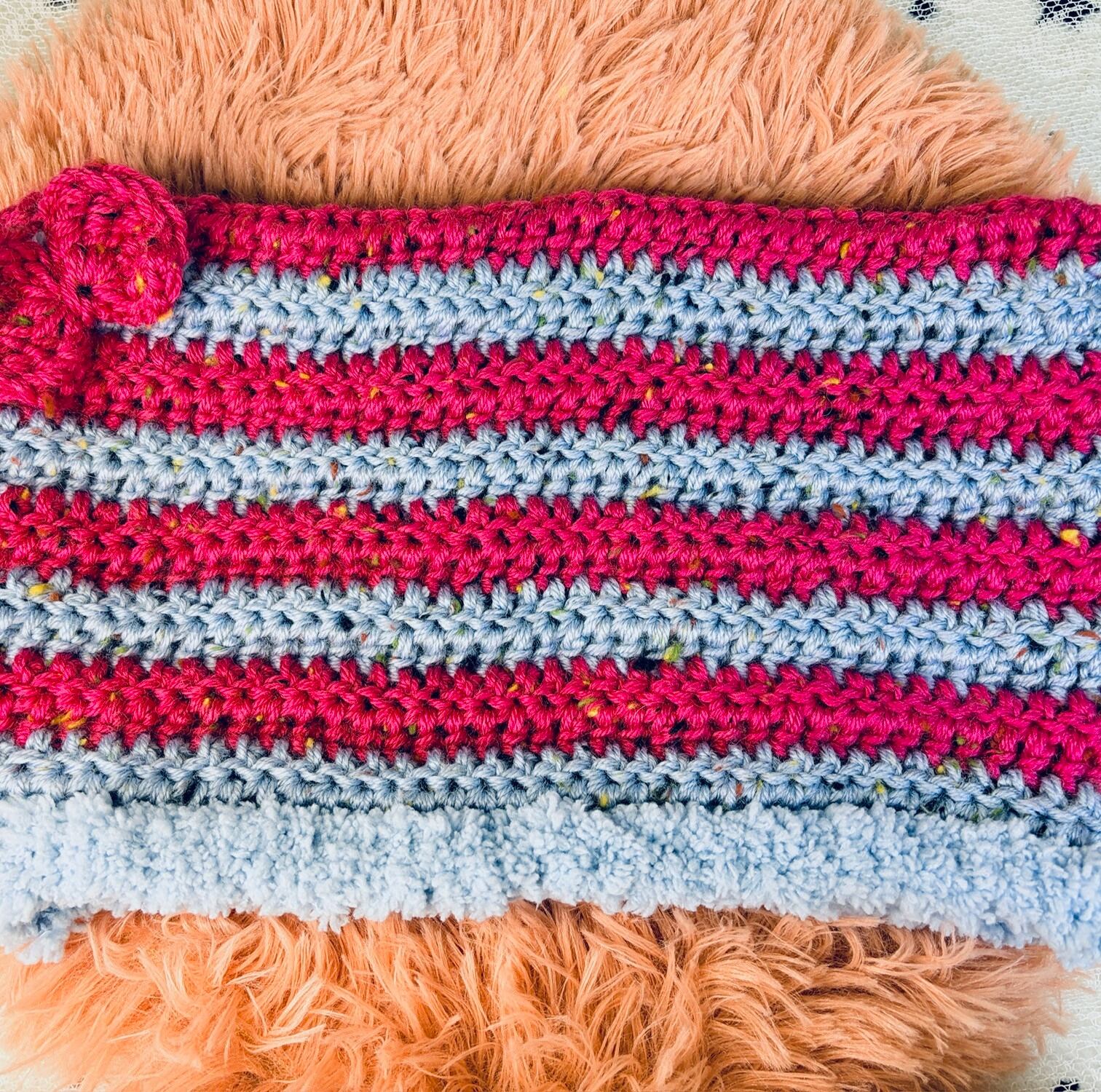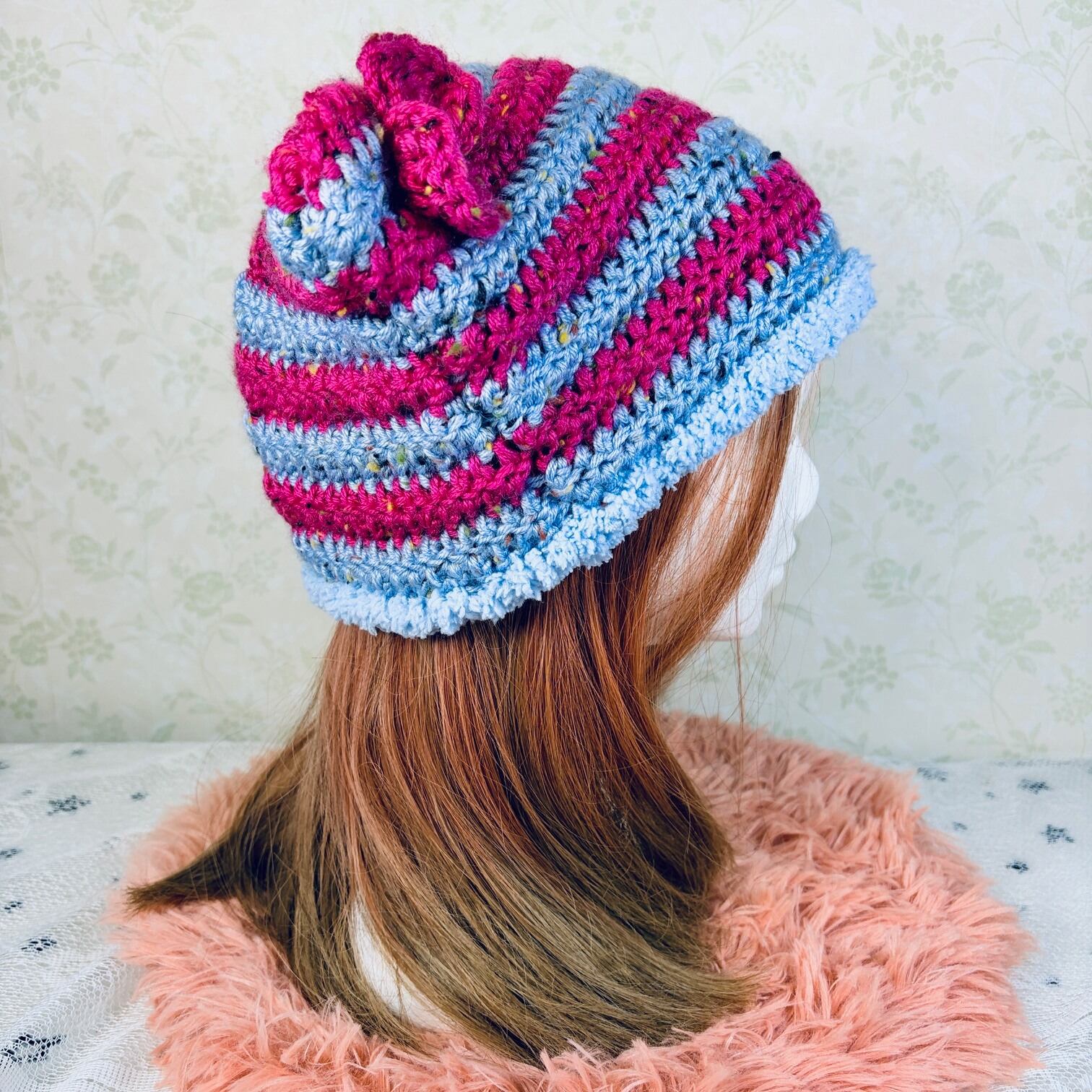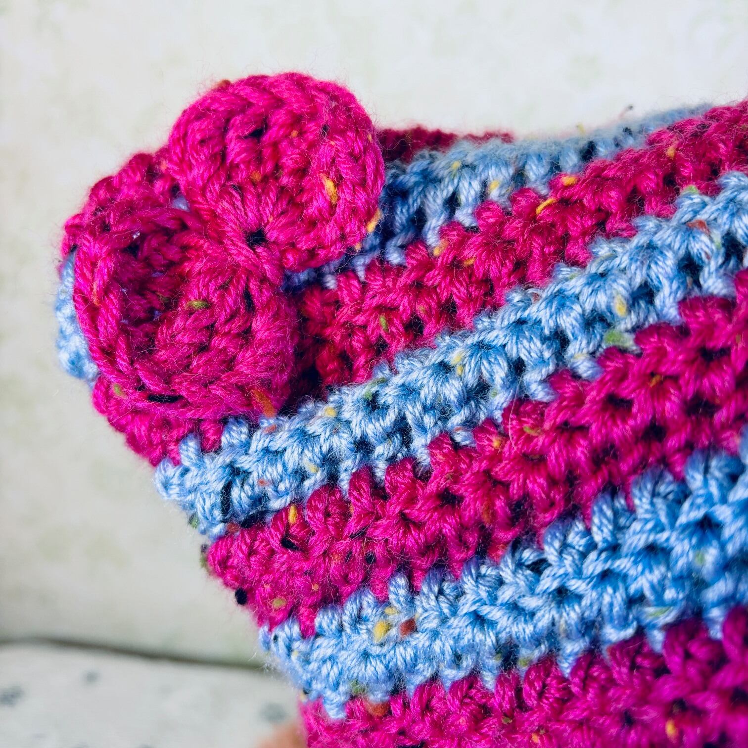 Adult Cat Ear Crochet Hat – Handmade with Holiday Tweed Yarn – Unique Design in pink and blue stripes