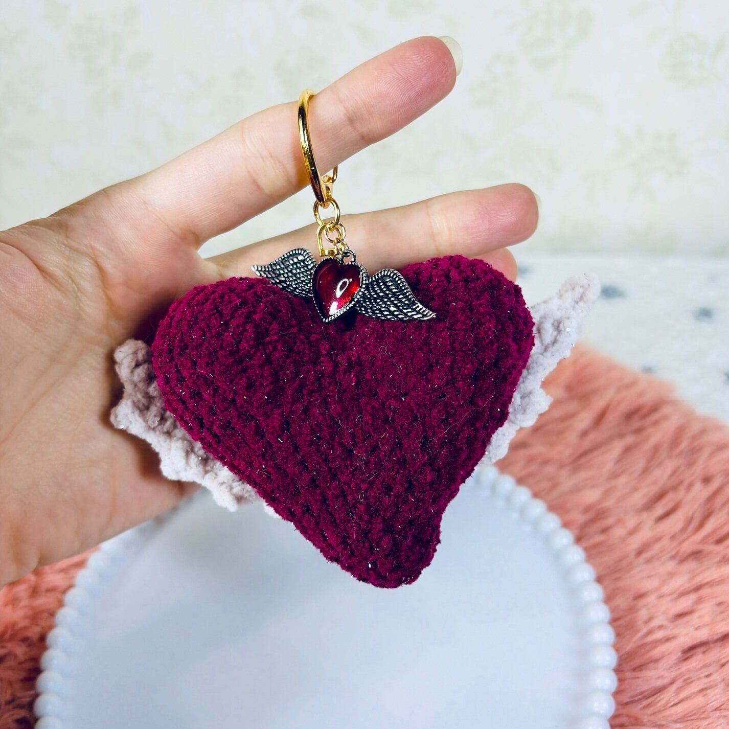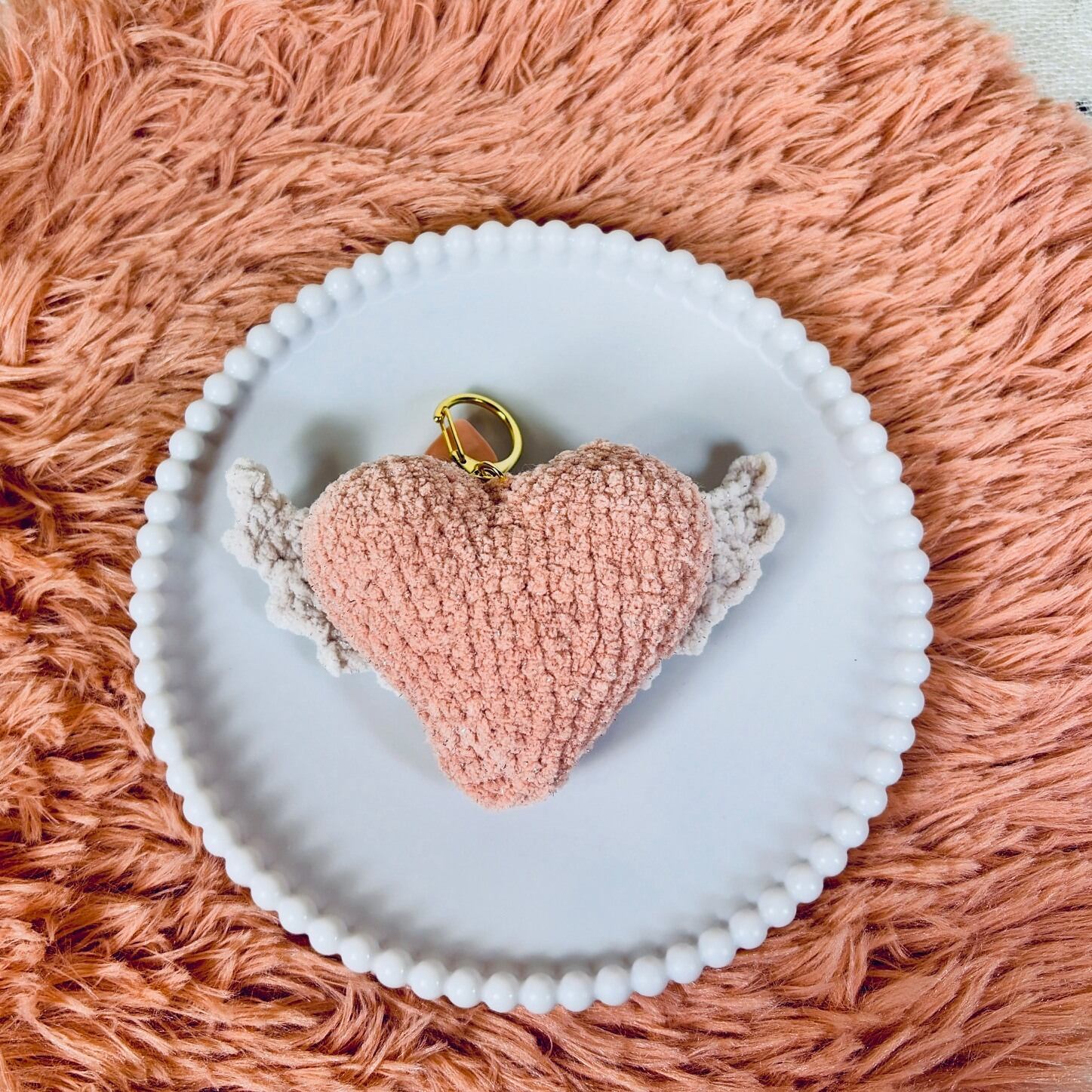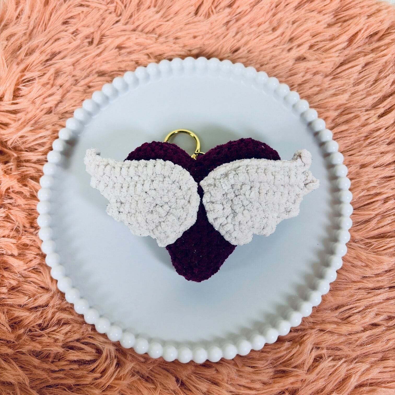 This handmade amigurumi keychain features a soft heart with delicate little wings,