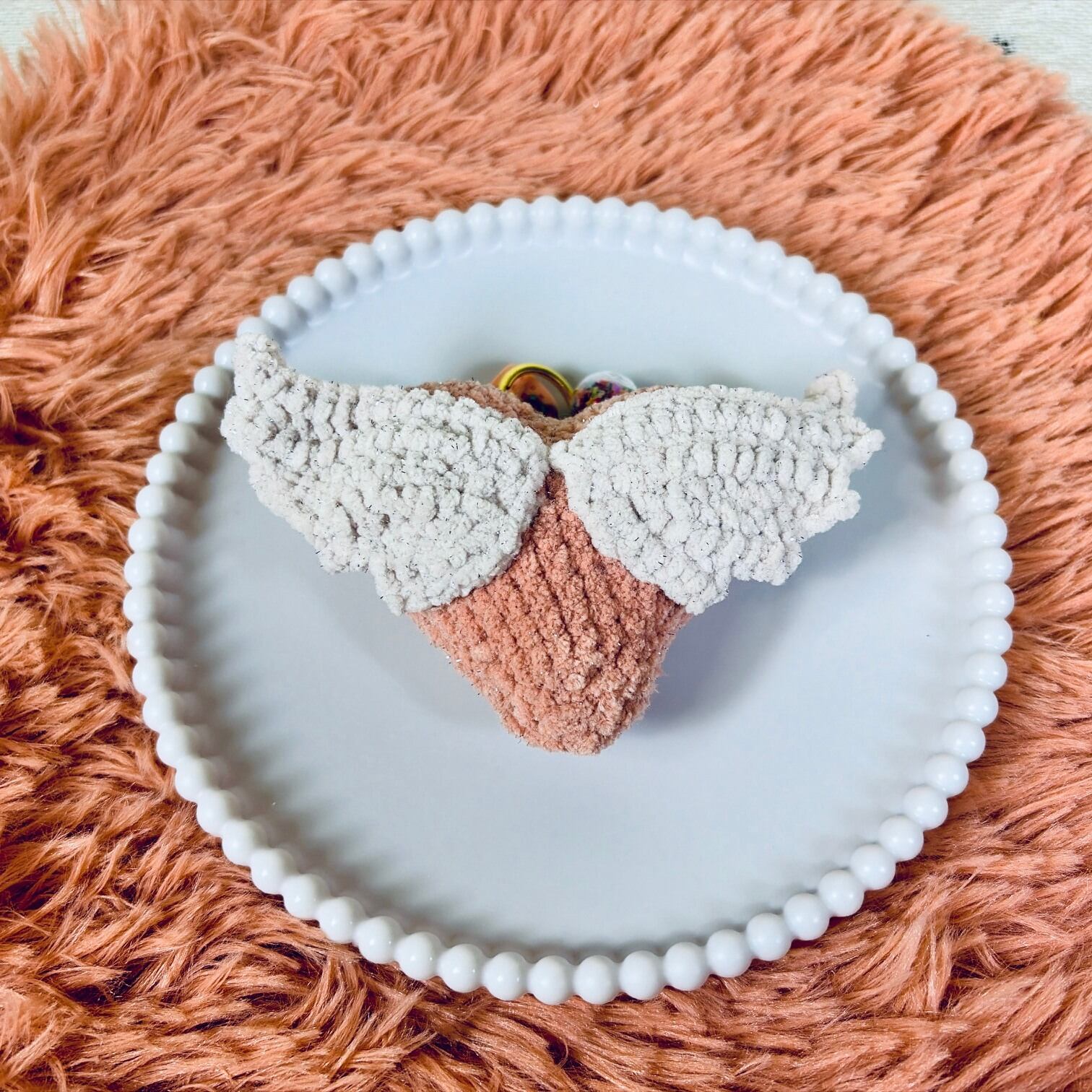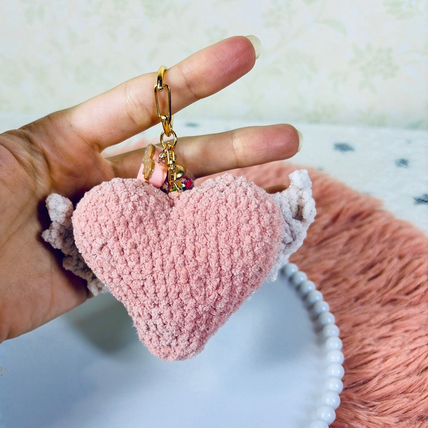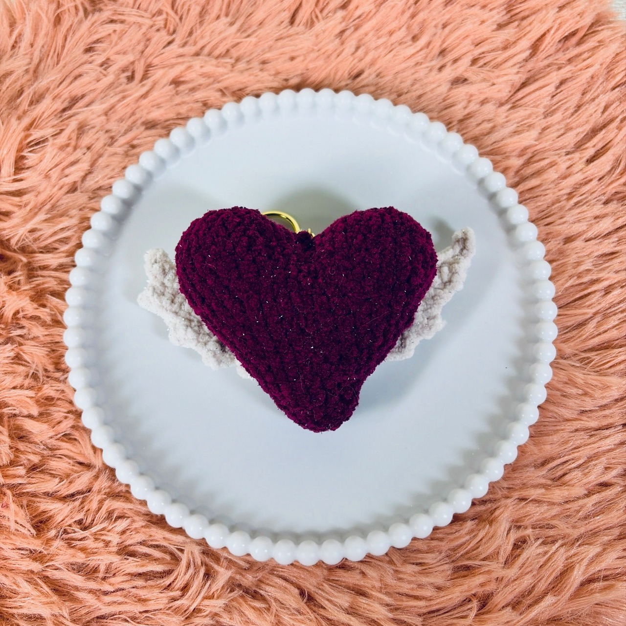 This handmade amigurumi keychain features a soft heart with delicate little wings,