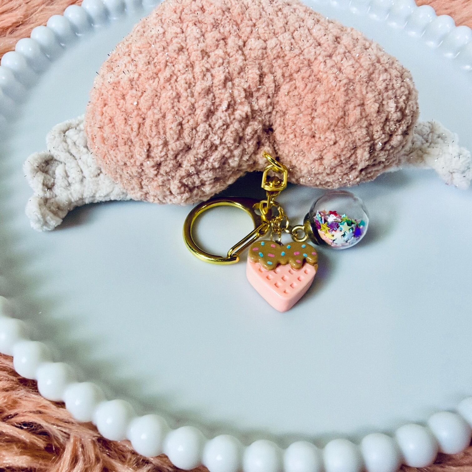 Its plush texture and three-dimensional shape make it a charming accent for your bag, pouch, or keys.