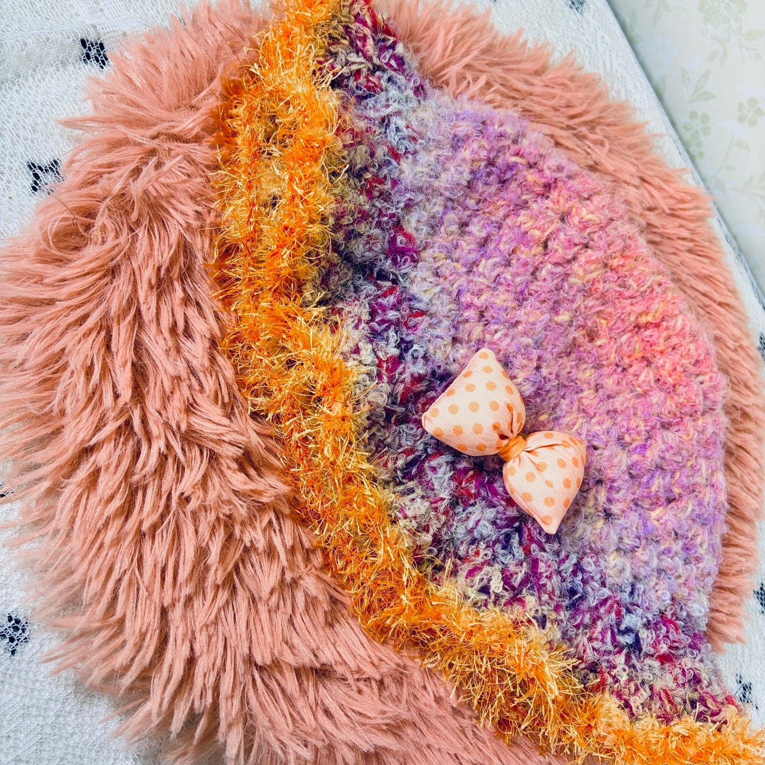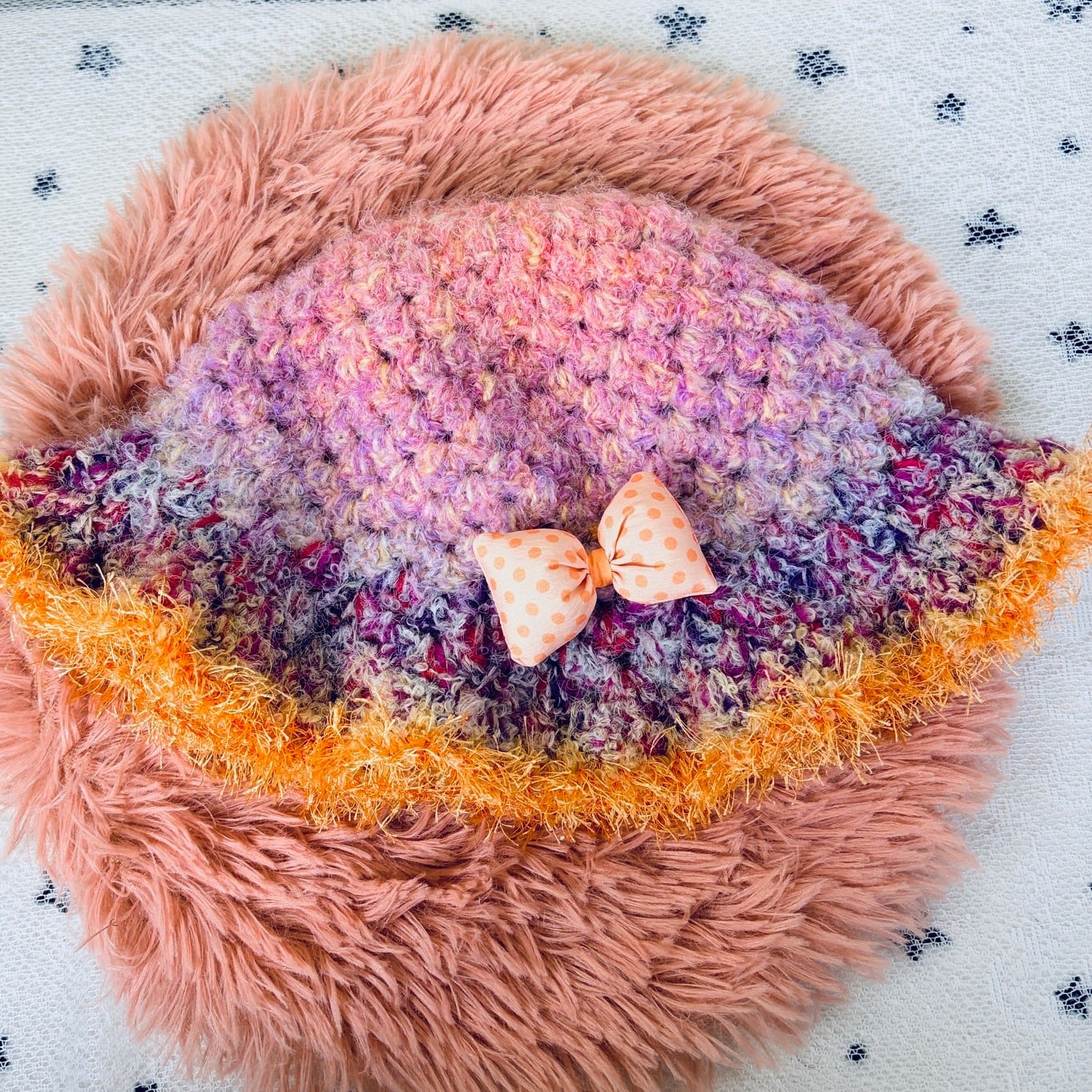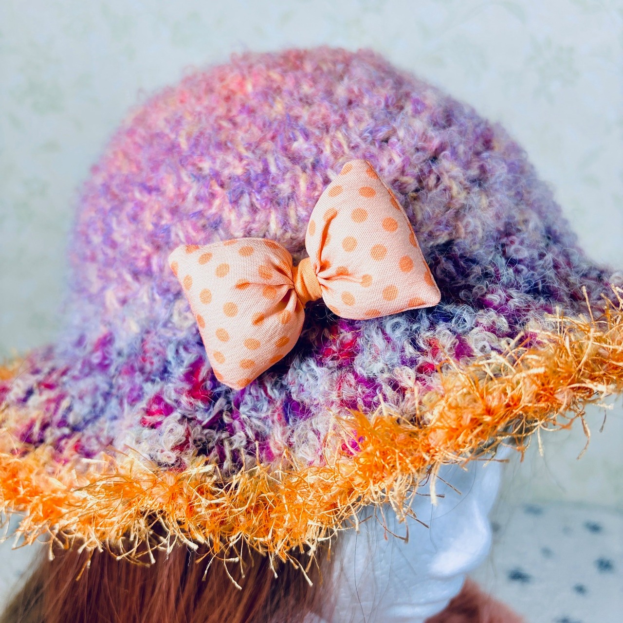 This one-of-a-kind handmade crochet hat is carefully crafted using colorful mixed yarn, creating a soft texture and a truly unique design.